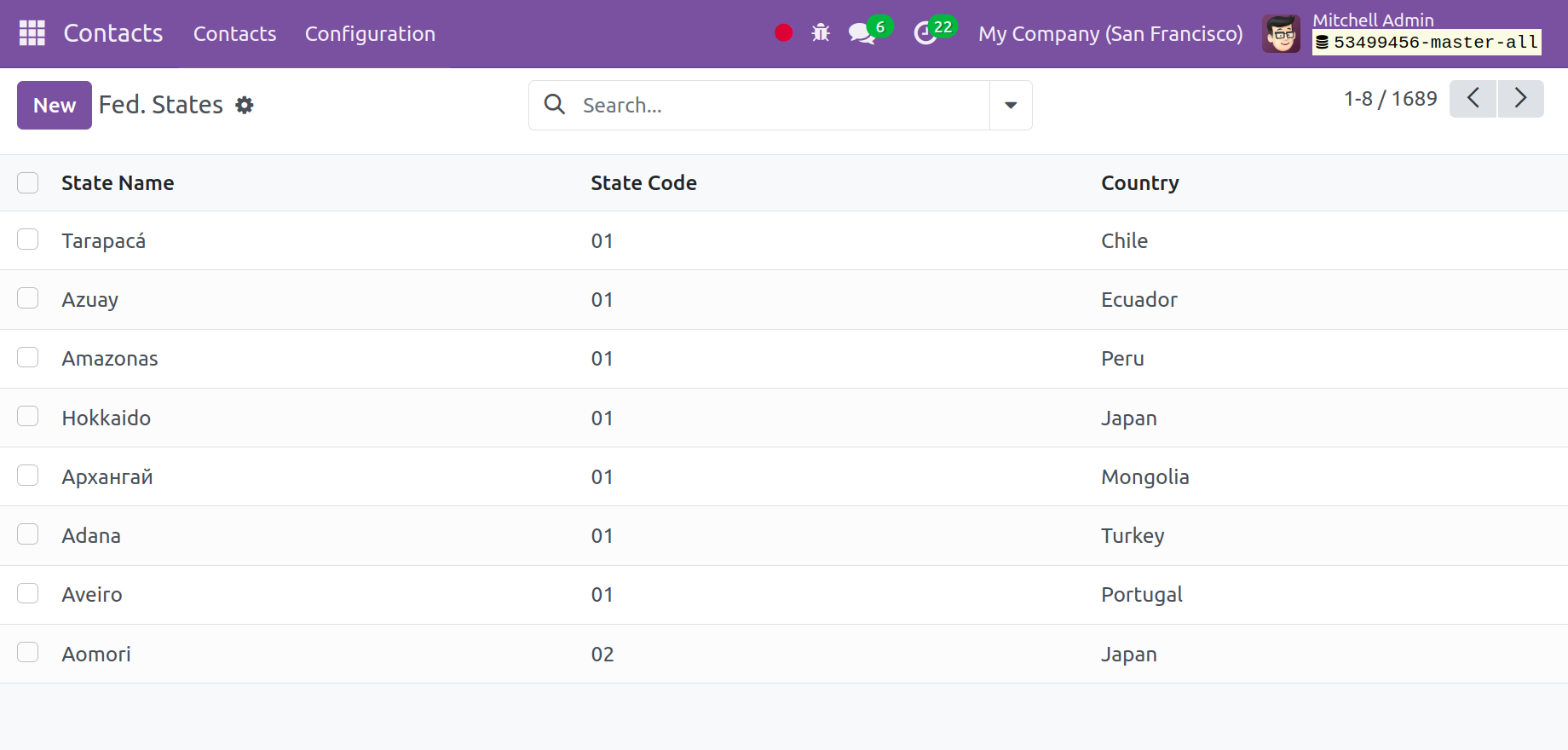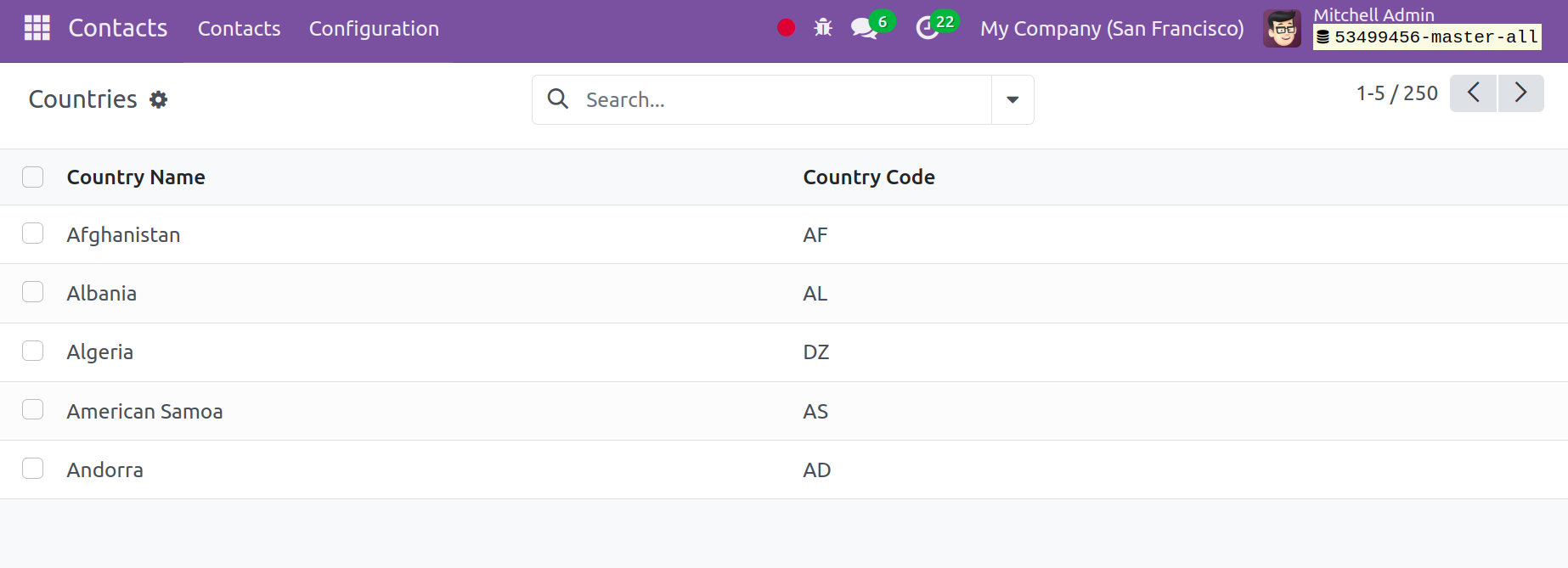Та Odoo ERP програм хангамжийн холбоо барих модулийн доорх тохиргооны цэснээс улс орнууд, Холбооны мужууд болон улс орнуудын бүлэглэл зэрэг сонголтуудыг олж болно. Улс орнуудын сонголтыг сонгосны дараа танд дараах хуудас харагдах болно.