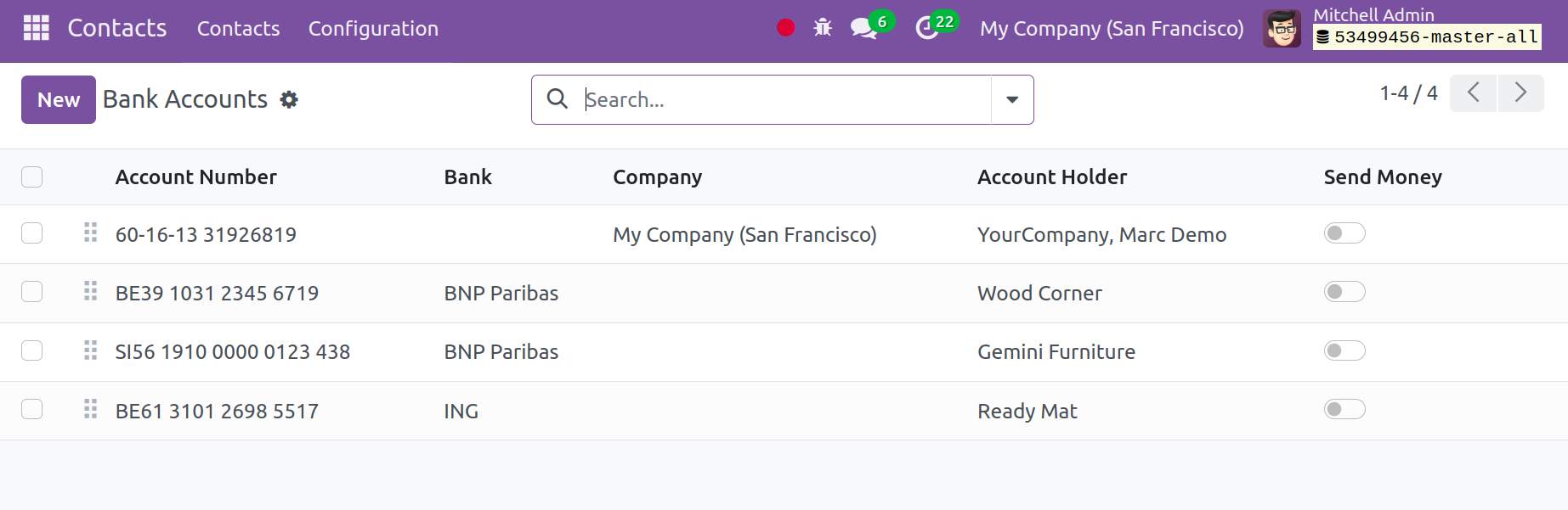 Та холбоо барих модуль дотор шинэ банкны данс үүсгэж болно. Тохиргооны цэс энэ сонголтыг өгөх болно. Та энэ хуудсан дээр өмнө нь үүсгэсэн бүх банкны мэдээллийн жагсаалтыг олж болно. Мэдээлэлд дансны дугаар, нэр, данс эзэмшигчийн нэр, компанийн нэр, мөн хөрөнгийг зарцуулсан тохиолдолд идэвхжүүлэх түлхүүр орно.