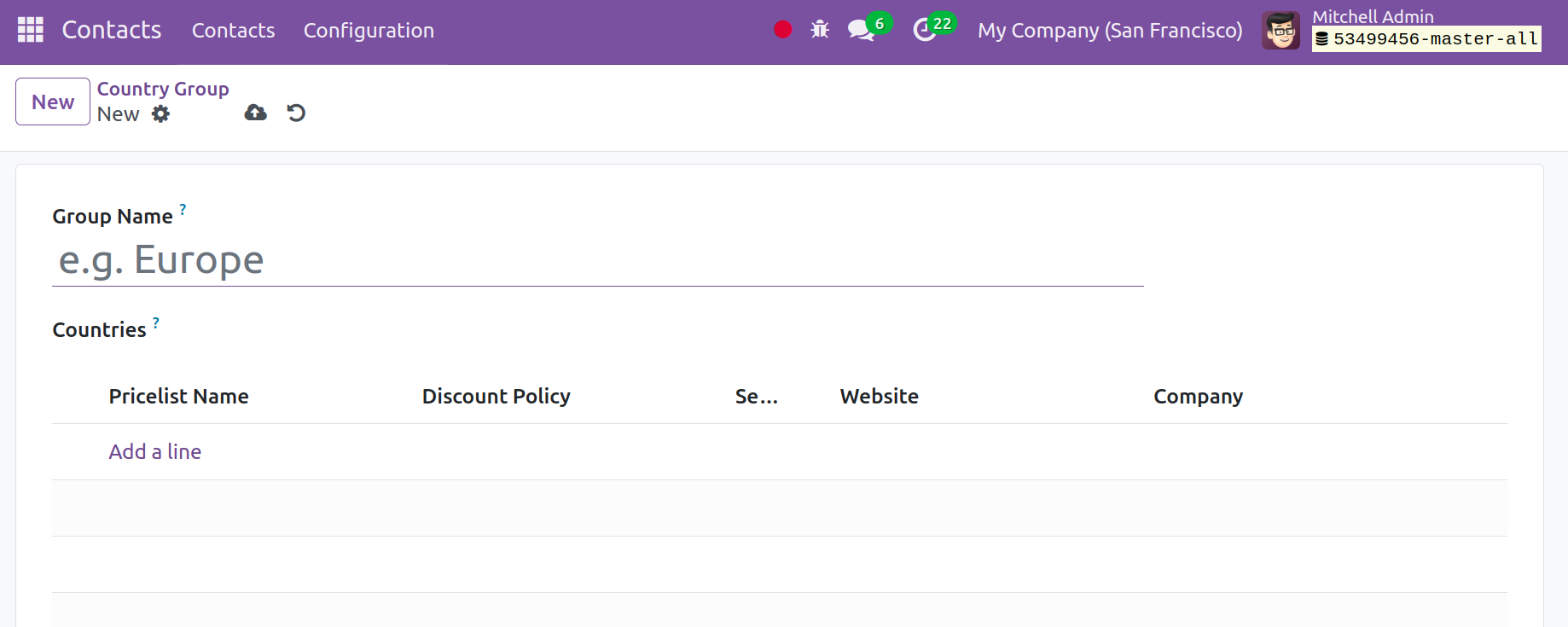 Бүтээх хуудсан дээр улсын бүлгийн нэр болон тухайн улсын нэрийг хоёуланг нь оруулах ёстой. Та зүгээр л "Мөр нэмэх" сонголтыг ашиглан доор нь шинэ үнийн жагсаалт нэмж болно. Энэхүү холбоо барих модулийн доор жагсаасан холбоо барих хүн нь тодорхой шинэчлэгдсэн үнийн жагсаалтыг дагаж мөрдөх болно. Зориулсан хэсэгт та Компанийн нэр, Вэбсайт, Валют, Хөнгөлөлтийн бодлогыг оруулах сонголттой.