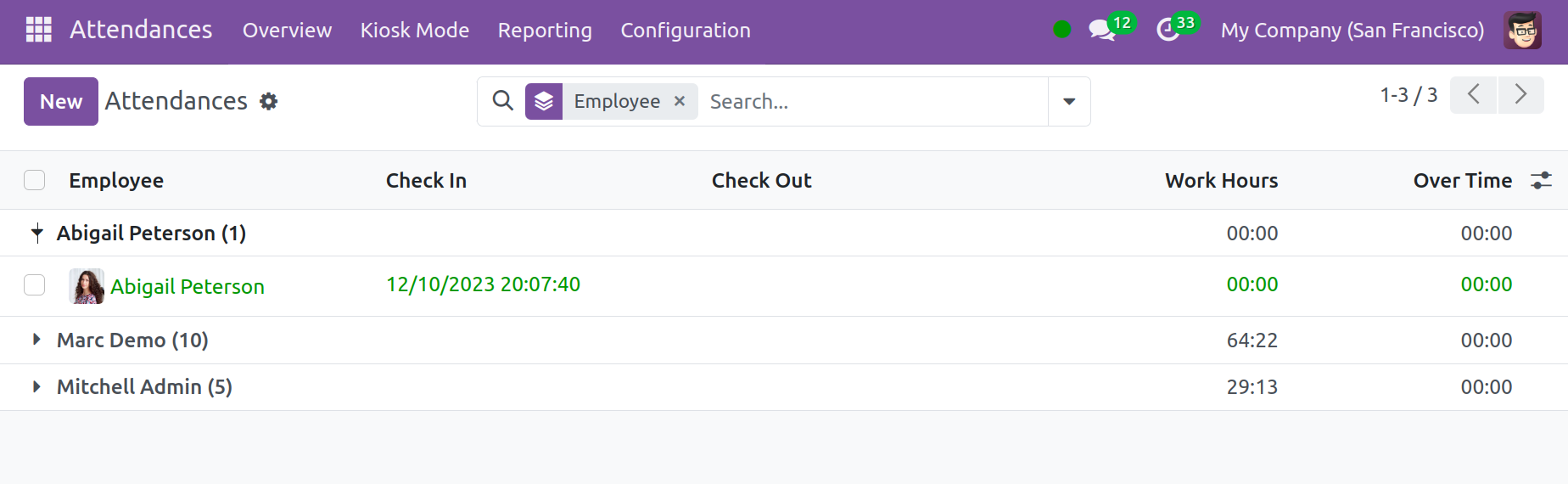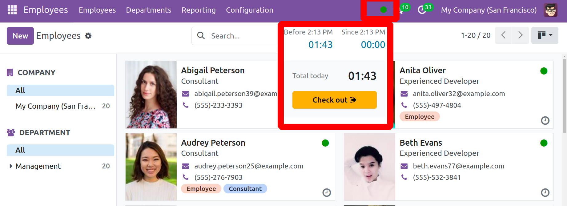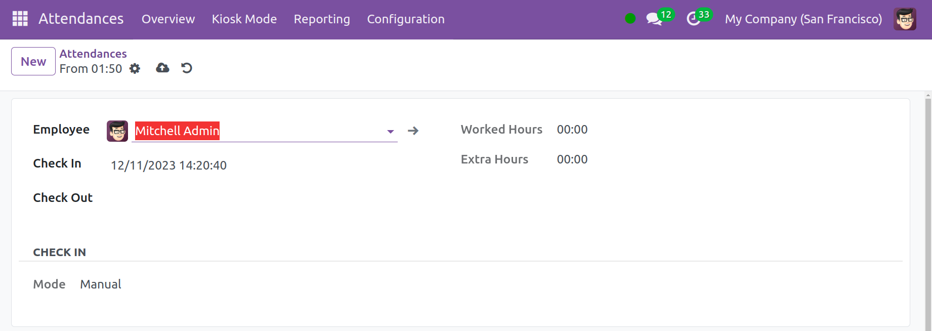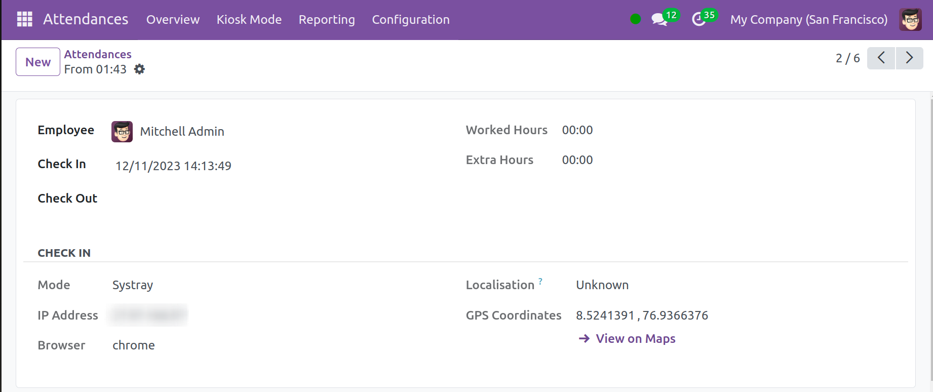 Доорх дэлгэцийн агшинд харагдаж байгаачлан, Odoo 17 ажилтны бүртгэлийн функцийг одоо аппликейшнаас гадуур ашиглаж болно. Бүртгүүлэх хугацааг тодорхой харуулсан болно. Дараа нь ажилтан төлбөр тооцоогоо дуусгахын тулд "Төлбөр тооцоо" товчийг ашиглаж болно. Systray бүртгэл болон бүртгэлээс гарах функцийг Odoo 17-д оруулсан болно.