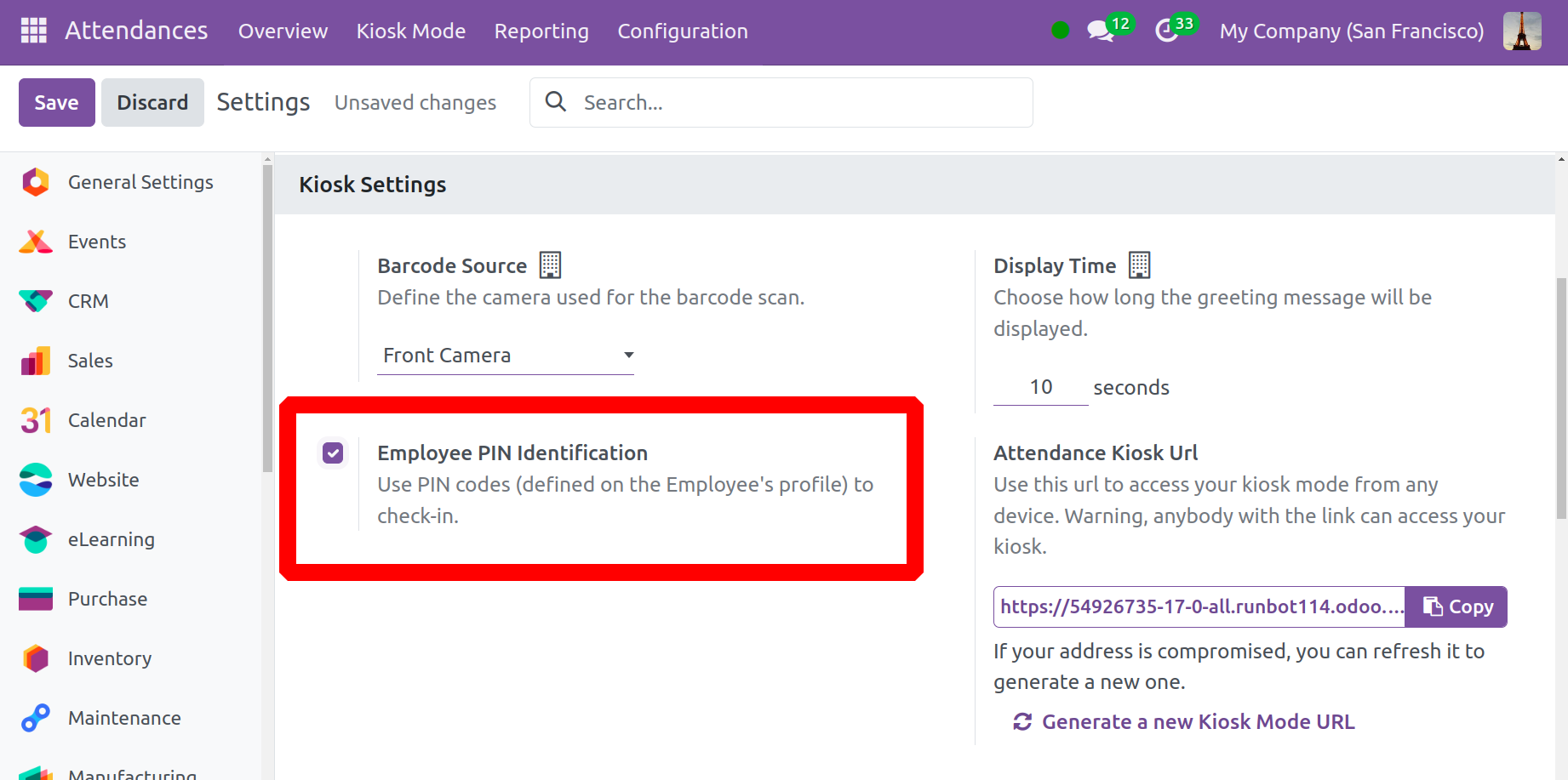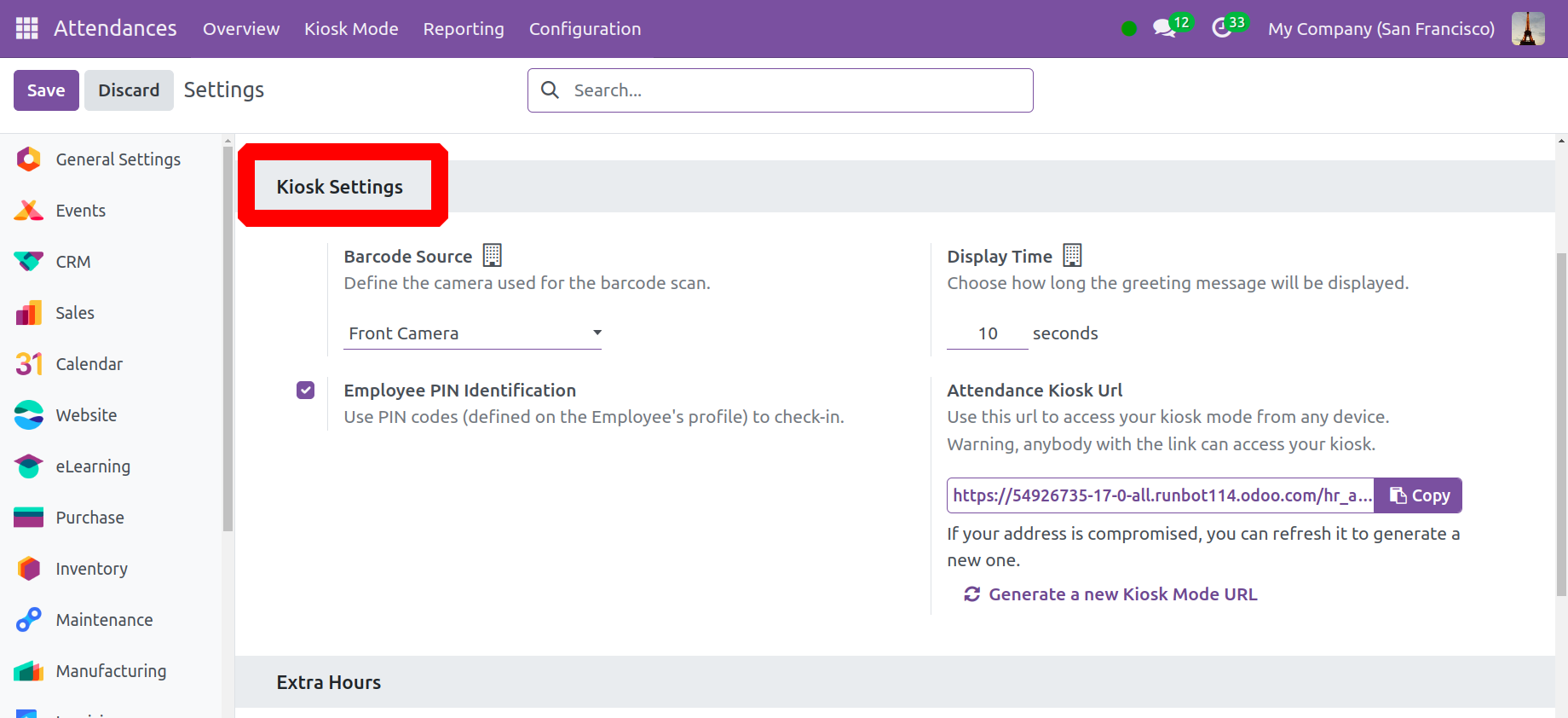 Хэрэглэгчид Киоск Тохиргооны хэсгийг хармагцаа програм бүрийг таних боломжтой . Баркод Эх сурвалжийн сонголтын доор та баркодыг сканнердахад ашигласан камерын талаар хэлэлцэж болно. Та " Хугацааг харуулах" сонголтыг ашиглан мэндчилгээний мессежийг хэдхэн секундын дотор тоглуулахыг сонгож болно. Ажилтан Ажилтны ПИН таних талбарыг идэвхжүүлсний дараа ажилдаа нэвтрэхийн тулд ПИН код ашиглаж болно . Киоск горимд бүх бүртгэл болон бүртгэлээс гарах мэдээллийг оруулсны дараа Хадгалах дүрс дээр дарна уу. Оролцоо нь Ирцийн Киоск URL хэсэгт өгөгдсөн URL-г ашиглан дурын төхөөрөмж дээрх таны киоск горимд ханддаг. Хэрэв интернет холболттой бол хэн ч таны киоск руу зочилж болно гэдгийг анхаарна уу. Хэрэв энэ нь эвдэрсэн бол та үүнийг шинэчлэн шинэ хаяг үүсгэж болно.