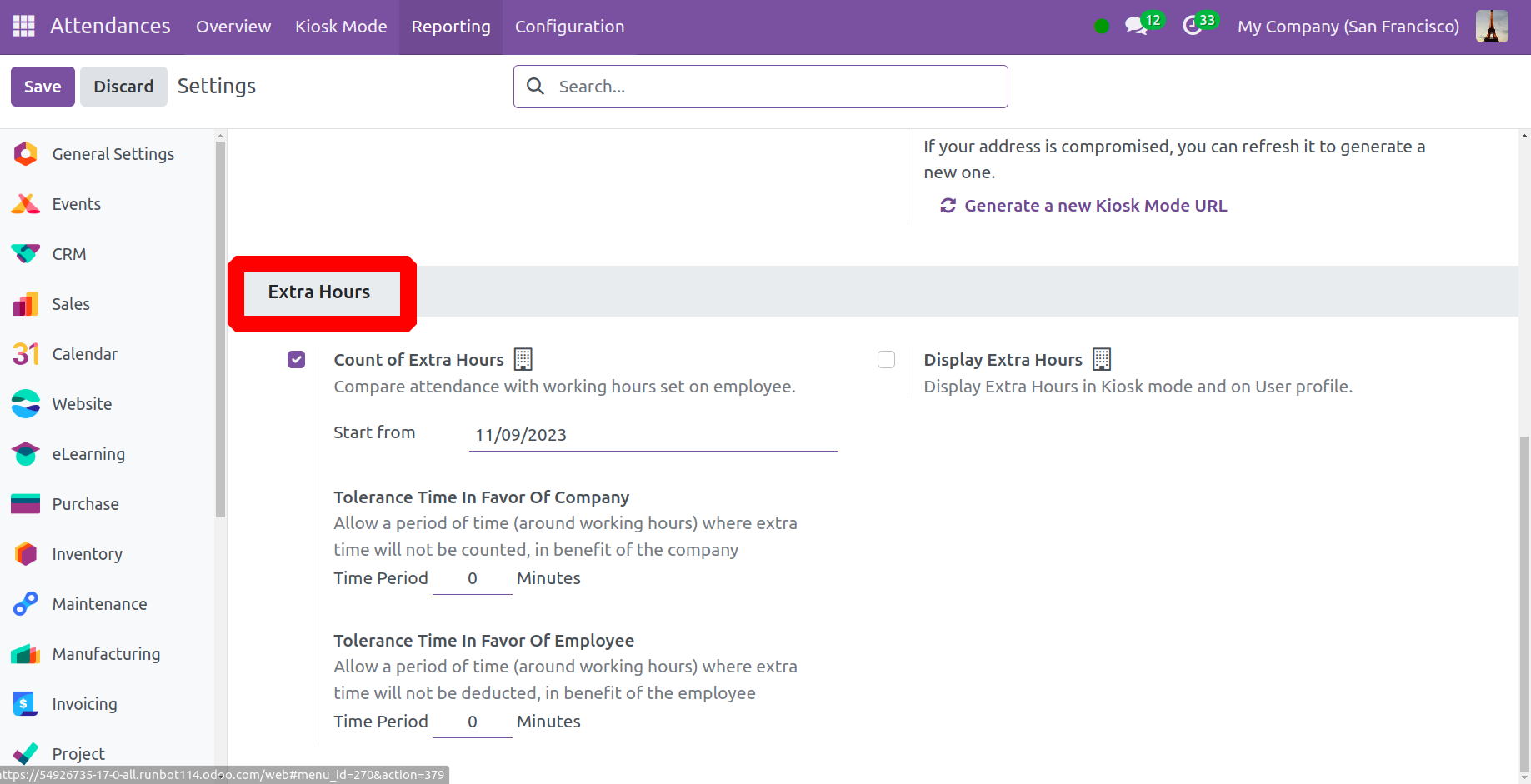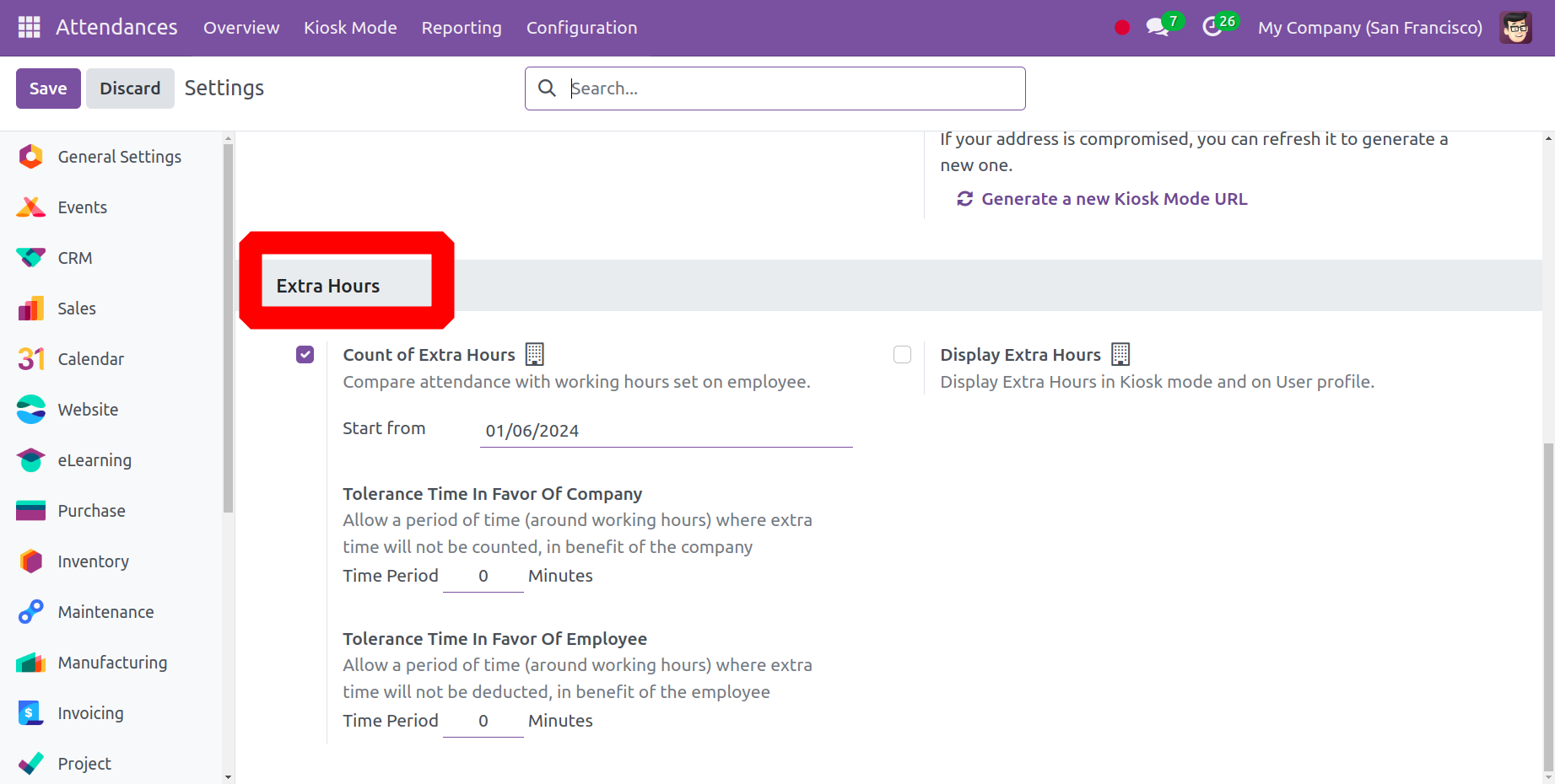 Дараагийн алхам бол Odoo 17 Ирц модульд тогтоосон нэмэлт цагийг удирдах явдал юм. Ирцийг тоолоход туслахын тулд та Нэмэлт цаг хэсгээс Нэмэлт цаг тоолох сонголтыг олж болно. Та эхлэх огноог сонгож, Нэмэлт цаг тоолох сонголтыг идэвхжүүлснээр ажилтны ажлын цаг дээр үндэслэн ирцийг харьцуулж болно. Нэмэлт цаг сонголтын доор та ажил олгогч болон ажилтанд ашигтай хүлцэх хугацааг тогтоож болно. Компанийн талд хүлцэх хугацаа дотор та компанийн тодорхой ажлын цагийг хурдан олгох боломжтой. Та мөн ажилтны талд хүлцэх хугацаа баганад ажилтныг дэмждэг, нэмэлт цагийг хасаагүй цагийг оруулах ёстой.