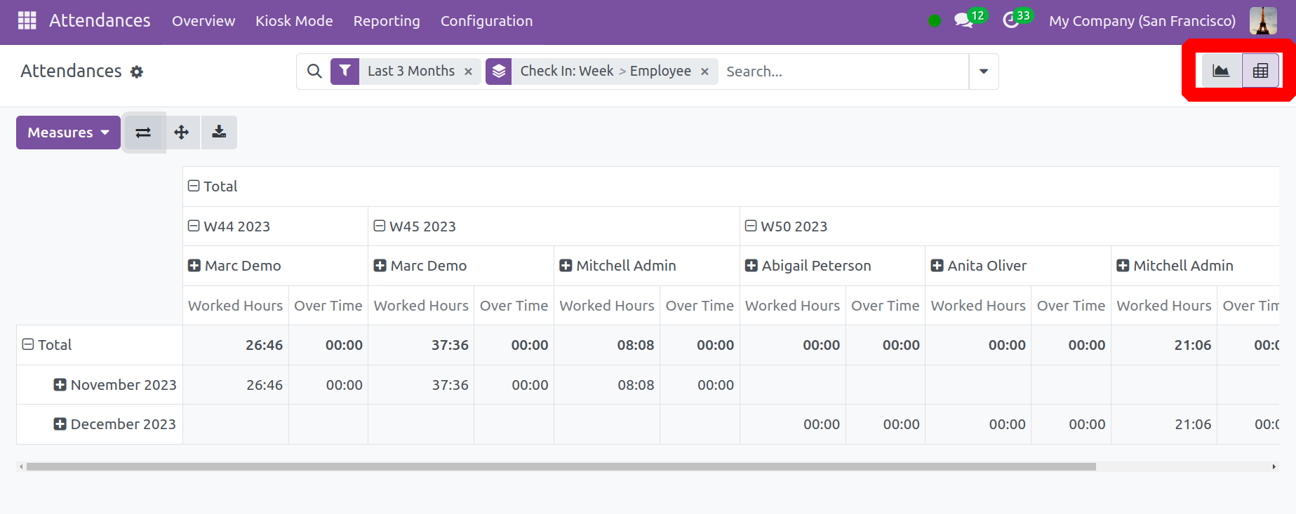Хэрэглэгчид долоо хоног тутмын, сар тутмын эсвэл жилийн ажилчдын ирцийн тайланг үүсгэх сонголттой. Ирцийн шинжилгээний тайланд хандахын тулд Odoo 17 Ирц дэх Тайлангууд табыг сонгоно уу. Ирцийн шинжилгээний цонхны график нь Y тэнхлэг дээрх тоо болон X тэнхлэг дээрх ажилтны бүртгэлийн өгөгдлийг харуулдаг. Хэрэглэгчид график дүрслэл дээрх ажилтан бүрийн бүртгэлийн дэлгэрэнгүй мэдээллийг өнгөний хязгаараар харж болно. Хэмжүүрийн дүрсийг сонгосноор бид графикт ажилтны илүү цаг, нийт ажилласан цагийн тоо зэрэг тодорхой өгөгдлийг оруулж болно.