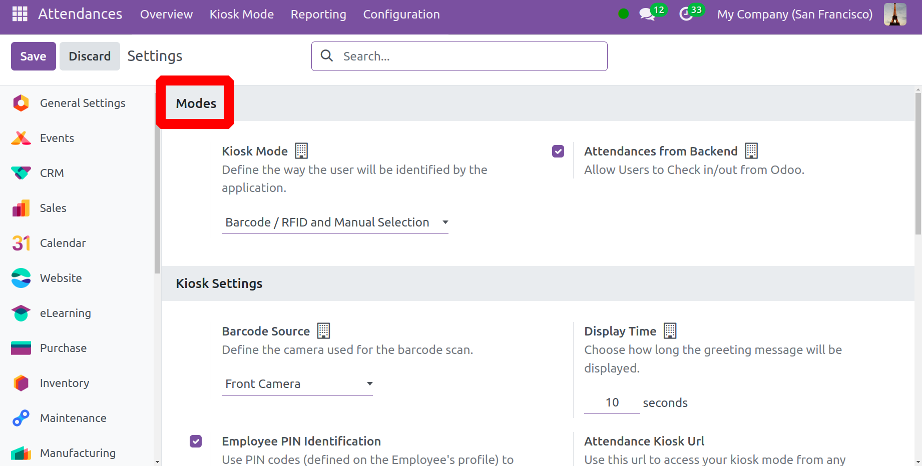 Горимыг сонгосны дараа хэрэглэгчид Киоск Горим хэсэгт киоск програмаар хэрхэн танигдахыг хүсч байгаагаа зааж өгч болно . Үүний дараа хэрэглэгчид Odoo руу орж гарахын тулд Backend-аас ирсэн хүмүүсийн оролцооны боломжийг ашиглаж болно.
