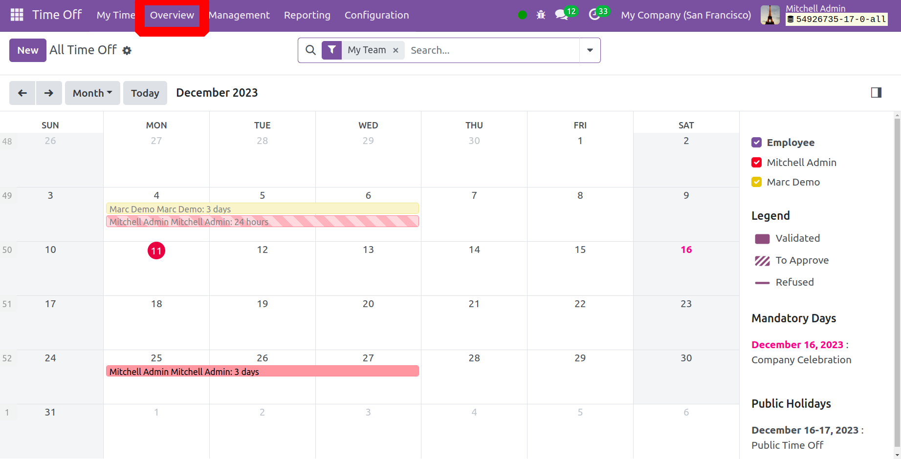 Odoo 17 ERP дахь Цагийн Чөлөөт Модуль нь Миний Чөлөөт Цаг, Тойм, Зөвшөөрөл, Тайлан, Тохиргоо зэрэг олон хэсэгтэй.