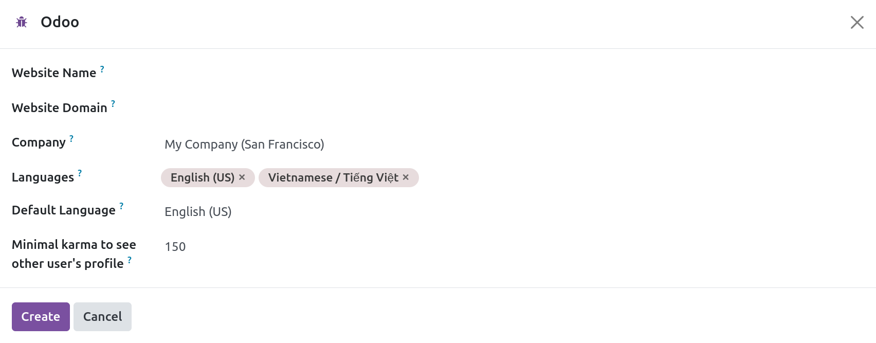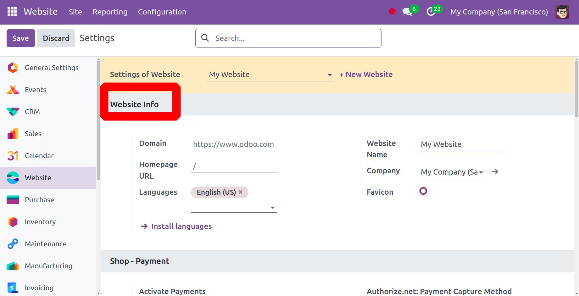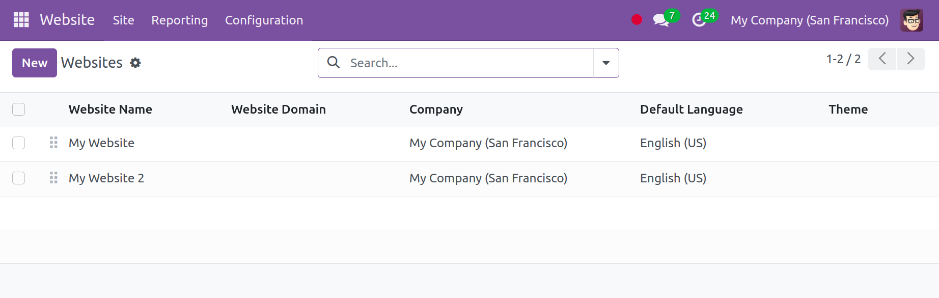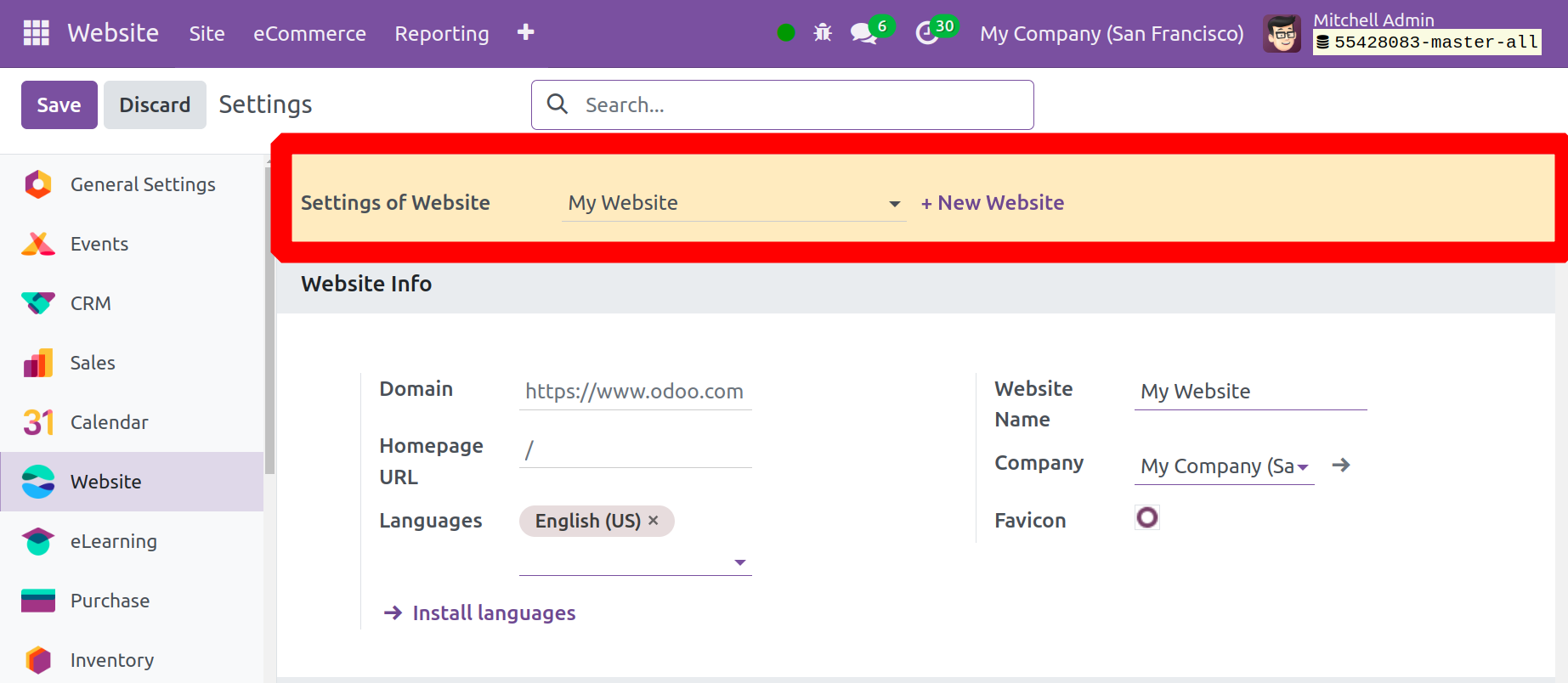 Та Odoo платформ ашиглан хэд хэдэн вэбсайтыг нэгэн зэрэг үүсгэж, удирдах боломжтой. Та Odoo 17-г ашиглан бизнесийн янз бүрийн хэрэгцээндээ зориулж олон вэбсайтыг илүү хялбархан удирдах боломжтой. Odoo 17 Вэбсайт модуль нь эдгээр вэбсайтуудыг удирдахад хялбар болгодог. Тохиргооны цэсэнд, вэбсайт модулийн Тохиргооны доор доор үзүүлсэн шиг шинэ вэбсайт үүсгэх сонголтыг олох болно.
