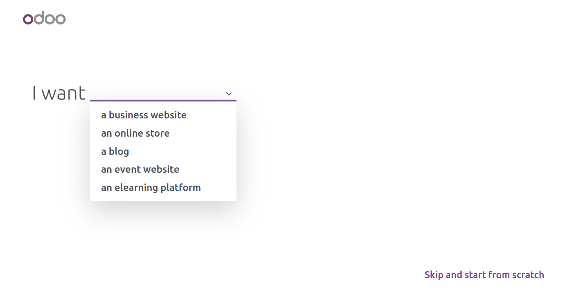 Дараа нь та вэбсайтын төрлийг шийдэх хэрэгтэй. "Бизнесийн вэбсайт, онлайн дэлгүүр, блог, арга хэмжээний вэбсайт, цахим сургалтын платформ" нь Odoo-ийн санал болгож буй төрлүүд юм. Вэбсайтын төрлийг сонгосны дараа түүний зорилгыг тодорхойлж болно. Систем нь танд шалтгааныг нь тайлбарласны дараа тохирох цэсийг сонгож болох унах цэсийг харуулах болно.