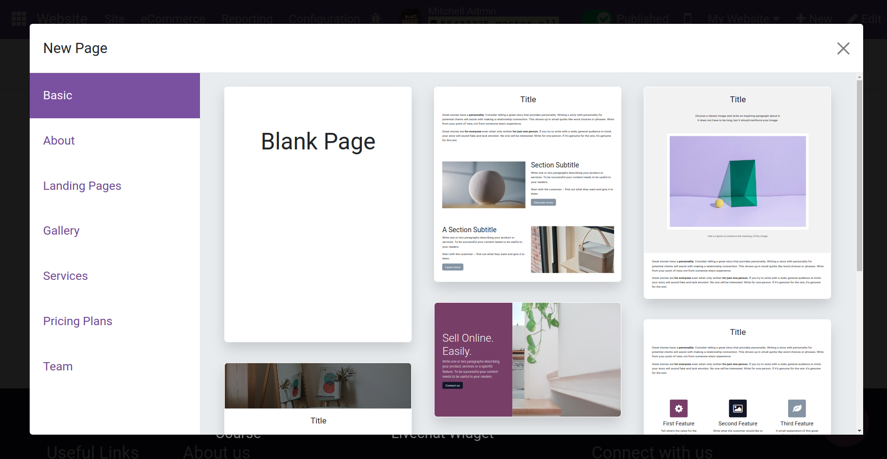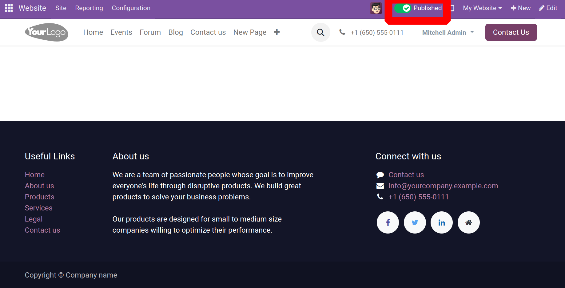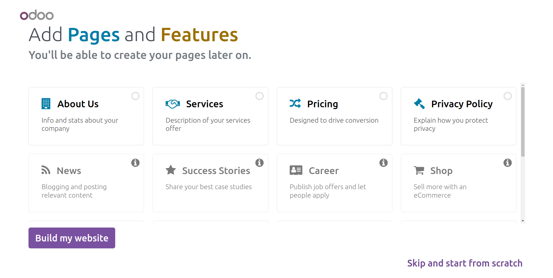 Бизнесүүд Odoo вэбсайт модулийн тусламжтайгаар өөрсдийн вэбсайтуудыг үүсгэж, засвар үйлчилгээ хийх боломжтой. Чирж буулгах вэбсайт бүтээгчийн тусламжтайгаар хэрэглэгчид вэбсайтыг хурдан үүсгэж, түүний харагдах байдал, мэдрэмжийг өөрчилж, бусад үйлчилгээтэй нэгтгэх боломжтой.