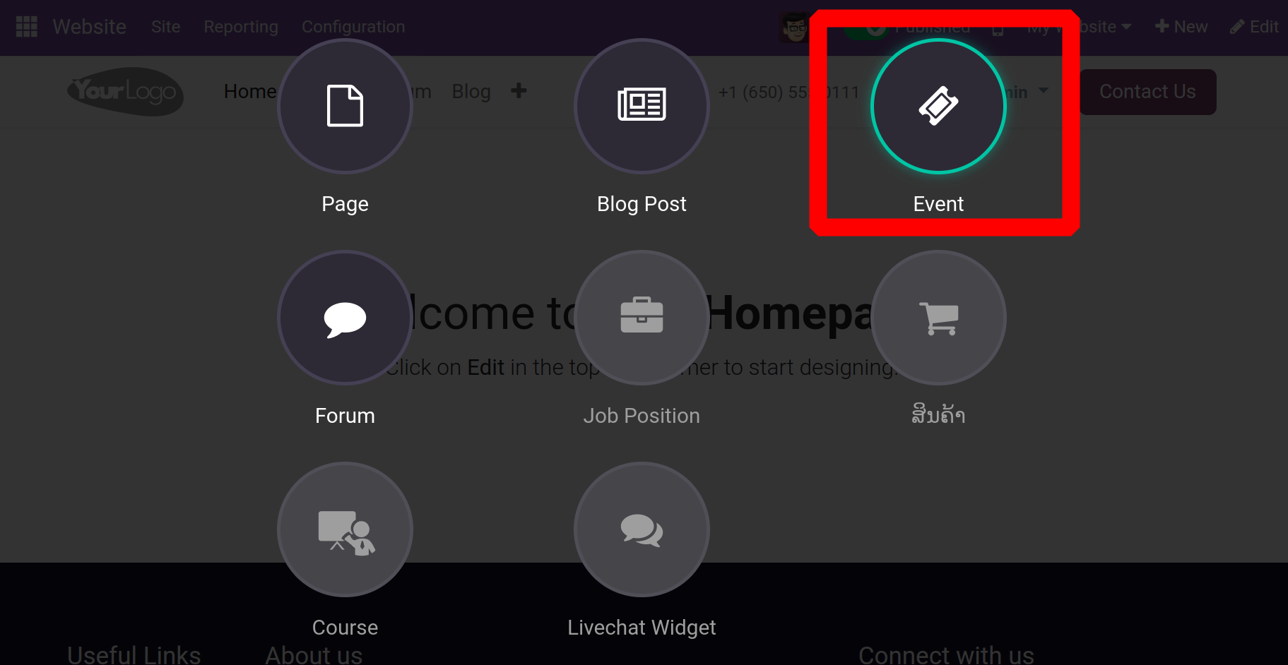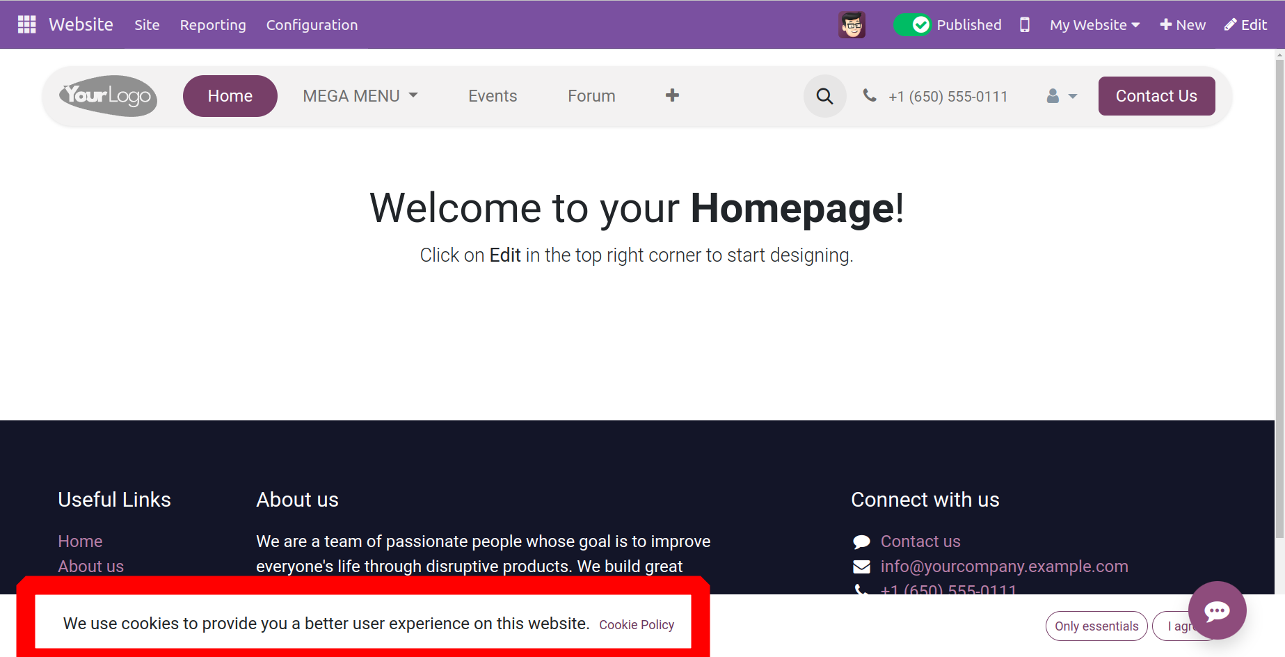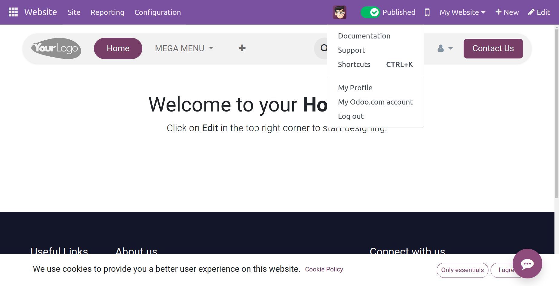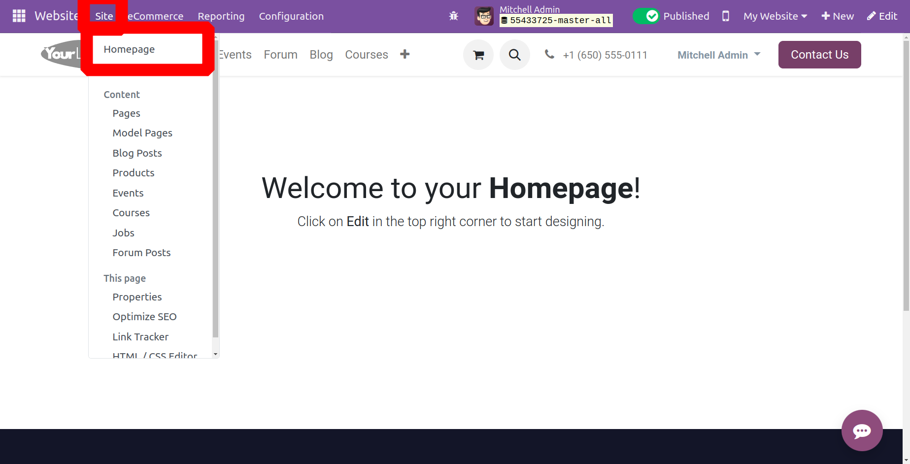 Танай бизнест зориулсан вэбсайт бүтээх маш сайн хэрэгсэл бол Odoo Website модуль юм. Таны хэрэгцээнд үндэслэн та платформыг ашиглан вэбсайтынхаа хуудсыг зохион бүтээж, бүтээх боломжтой. Odoo 17 Website модулийн Сайтын цэсийг дарснаар та Нүүр хуудас руу шилжих болно.
