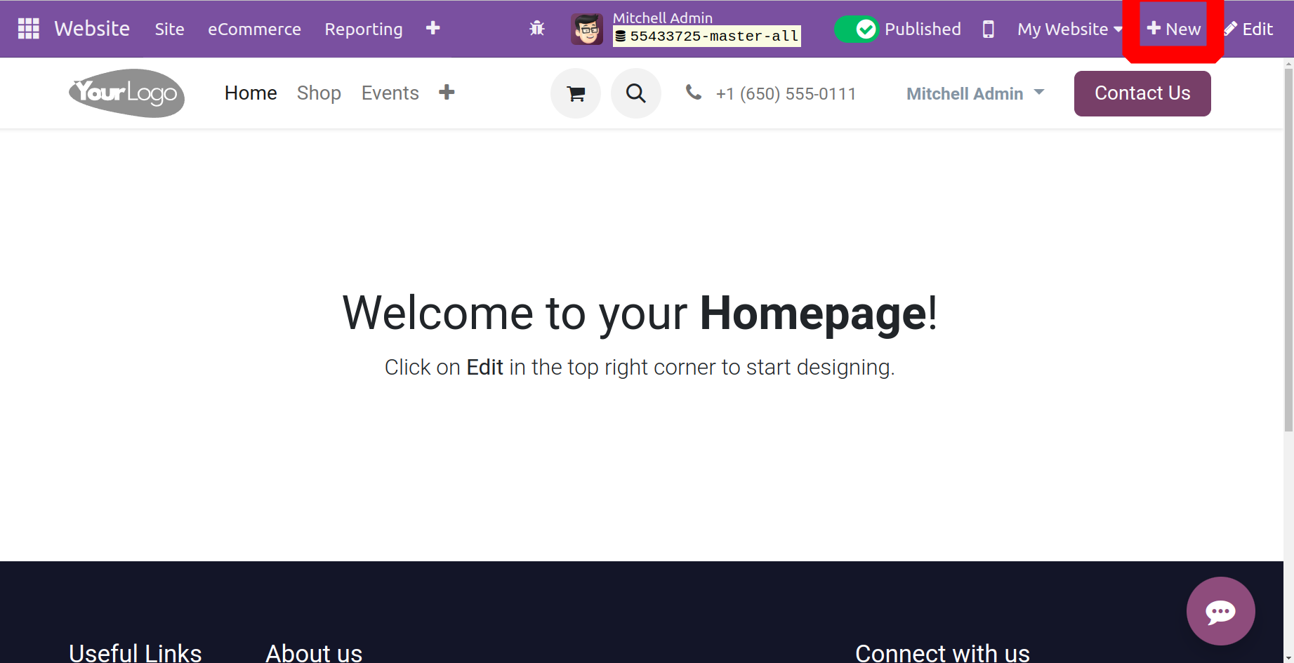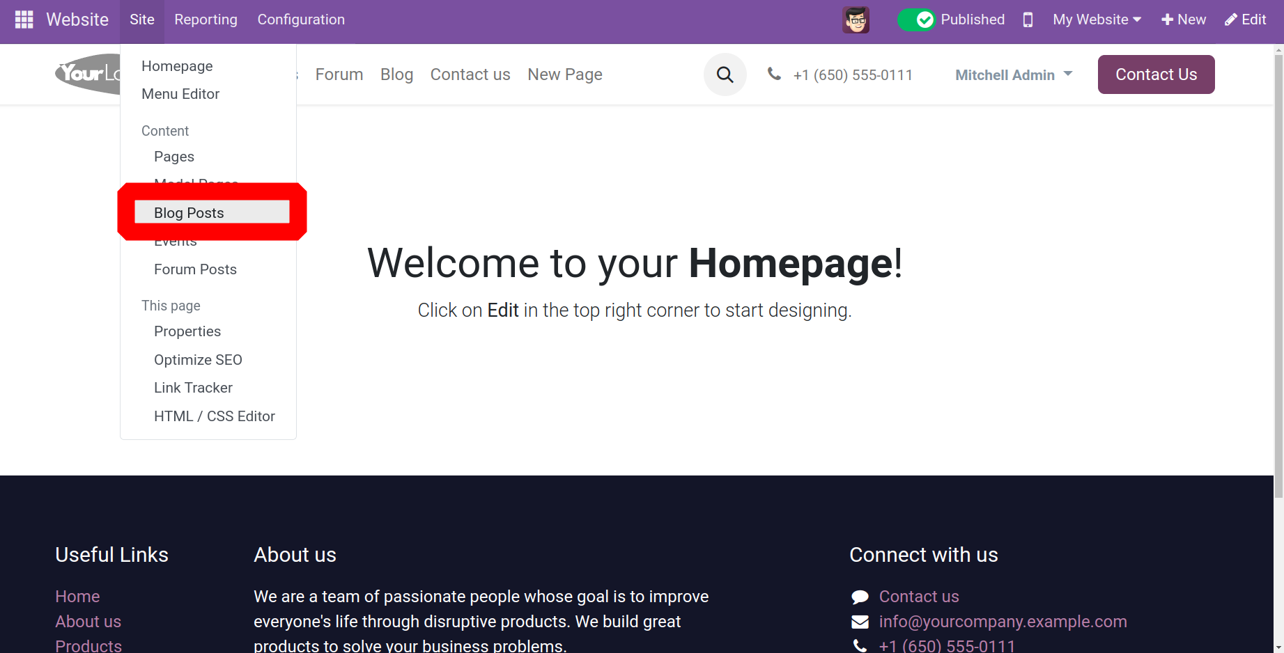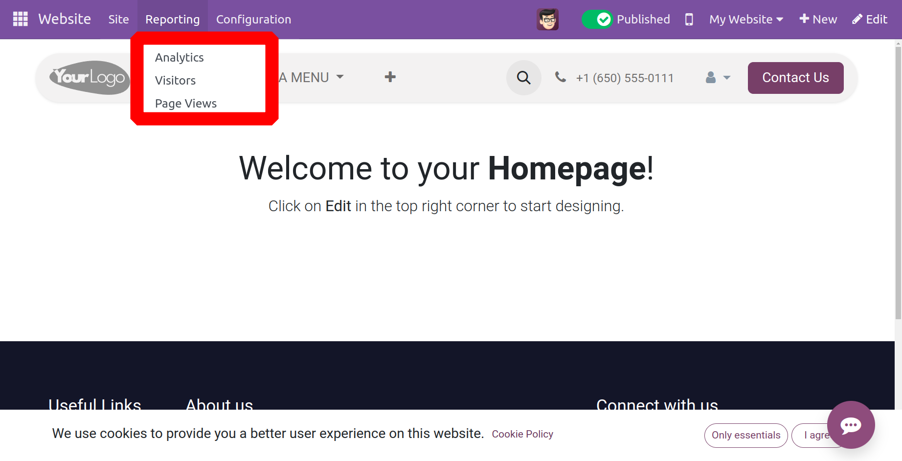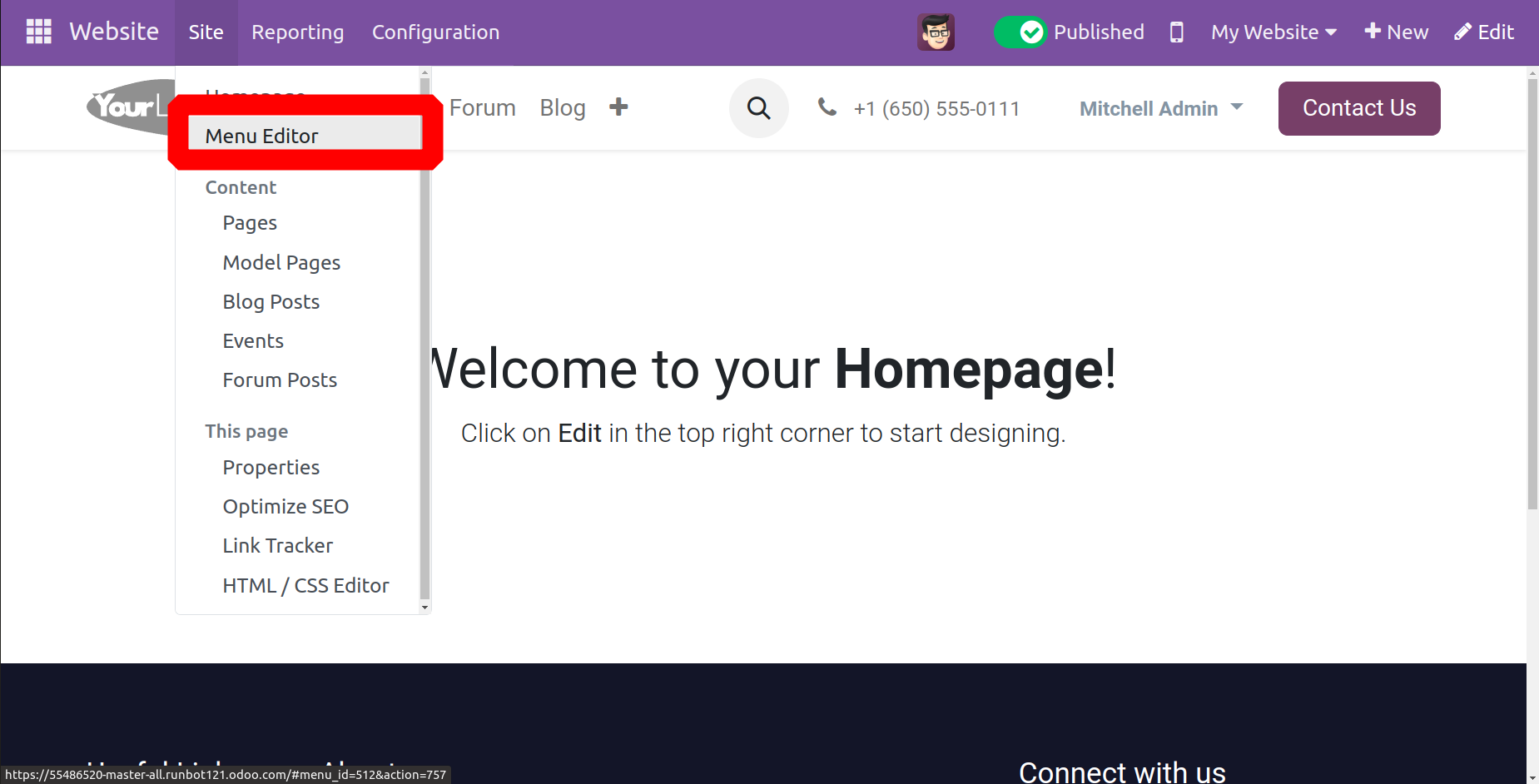 Танай бизнест зориулсан вэбсайт бүтээх маш сайн хэрэгсэл бол Odoo Website модуль юм. Таны хэрэгцээнд үндэслэн та платформыг ашиглан вэбсайтынхаа хуудсыг зохион бүтээж, бүтээх боломжтой. Odoo 17 Website модулийн Сайтын цэсийг дарснаар та Нүүр хуудас руу шилжих болно.