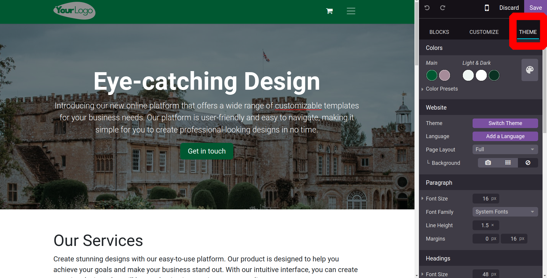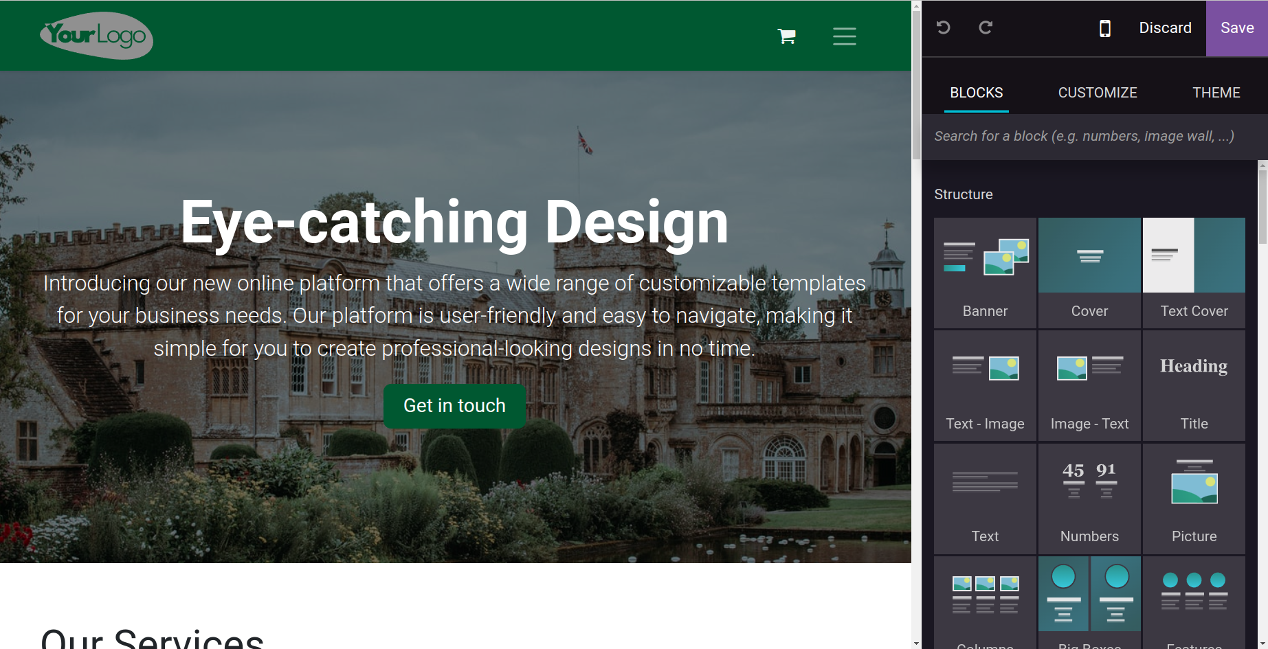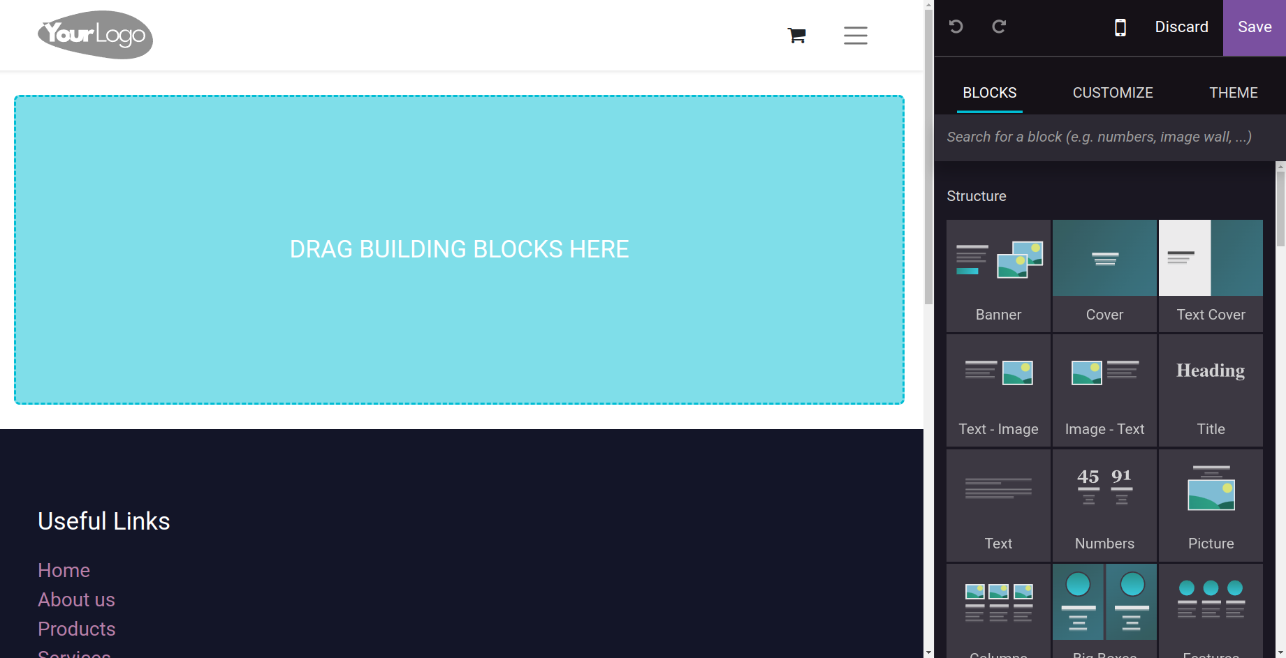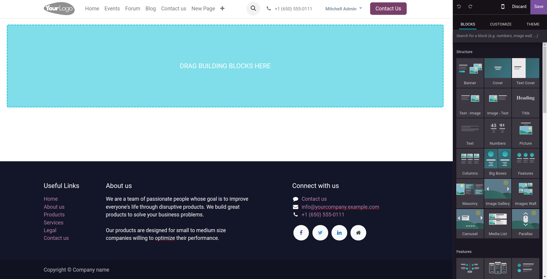 Дууссаны дараа Odoo систем нь танд тохирох вэбсайтын бүтцийг өгөх болно. Та цонхны баруун талд байгаа янз бүрийн барилгын блокууд, тохируулгын тохиргоо болон сэдвүүдийг ашиглан гайхалтай вэбсайт бүтээх боломжтой.