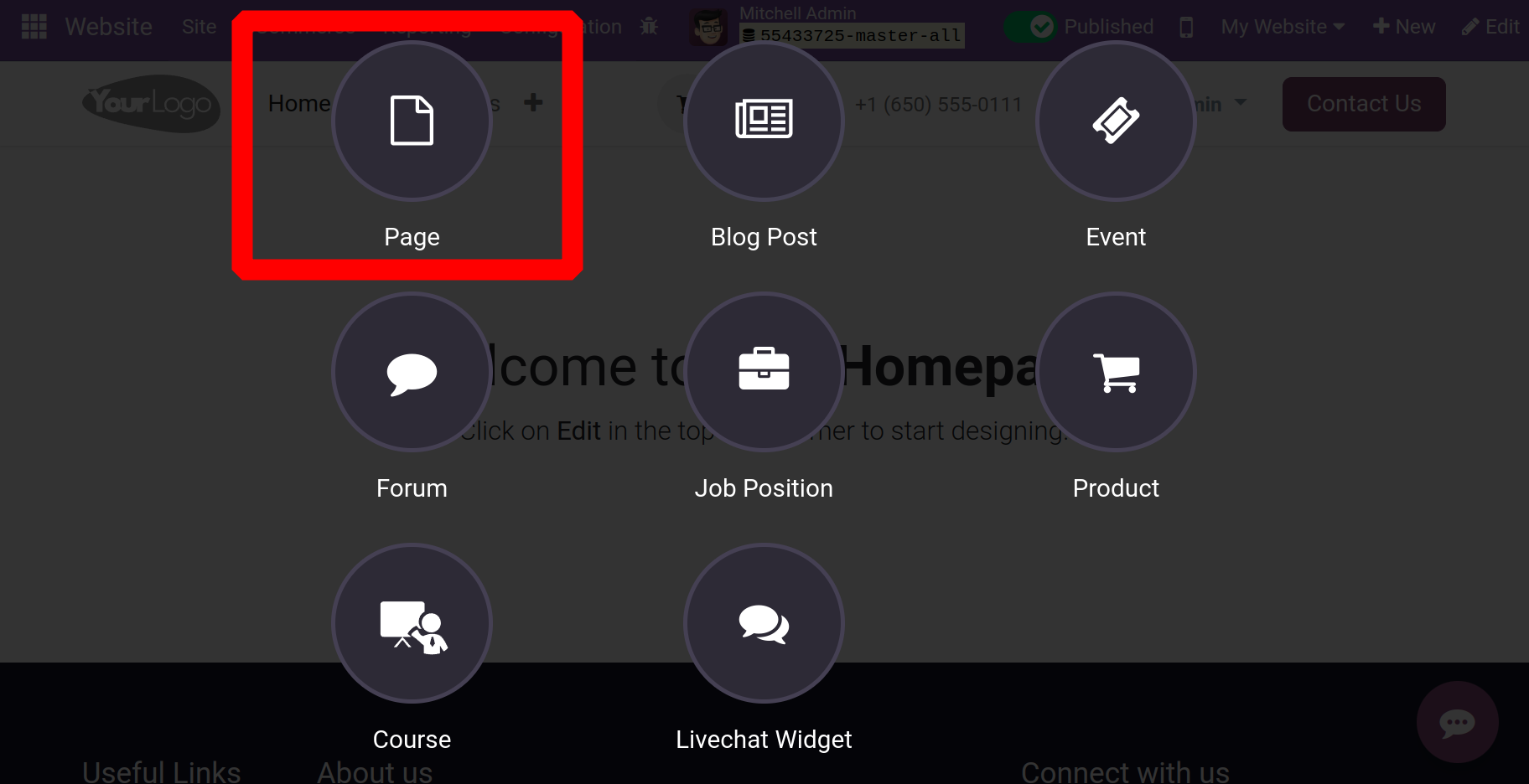 "Шинэ хуудас" сонголтыг ашиглан хуудас, блог нийтлэл, арга хэмжээ, форум, ажлын боломж, бүтээгдэхүүн, сургалт, шууд чатын виджетийг үүсгэж болно .