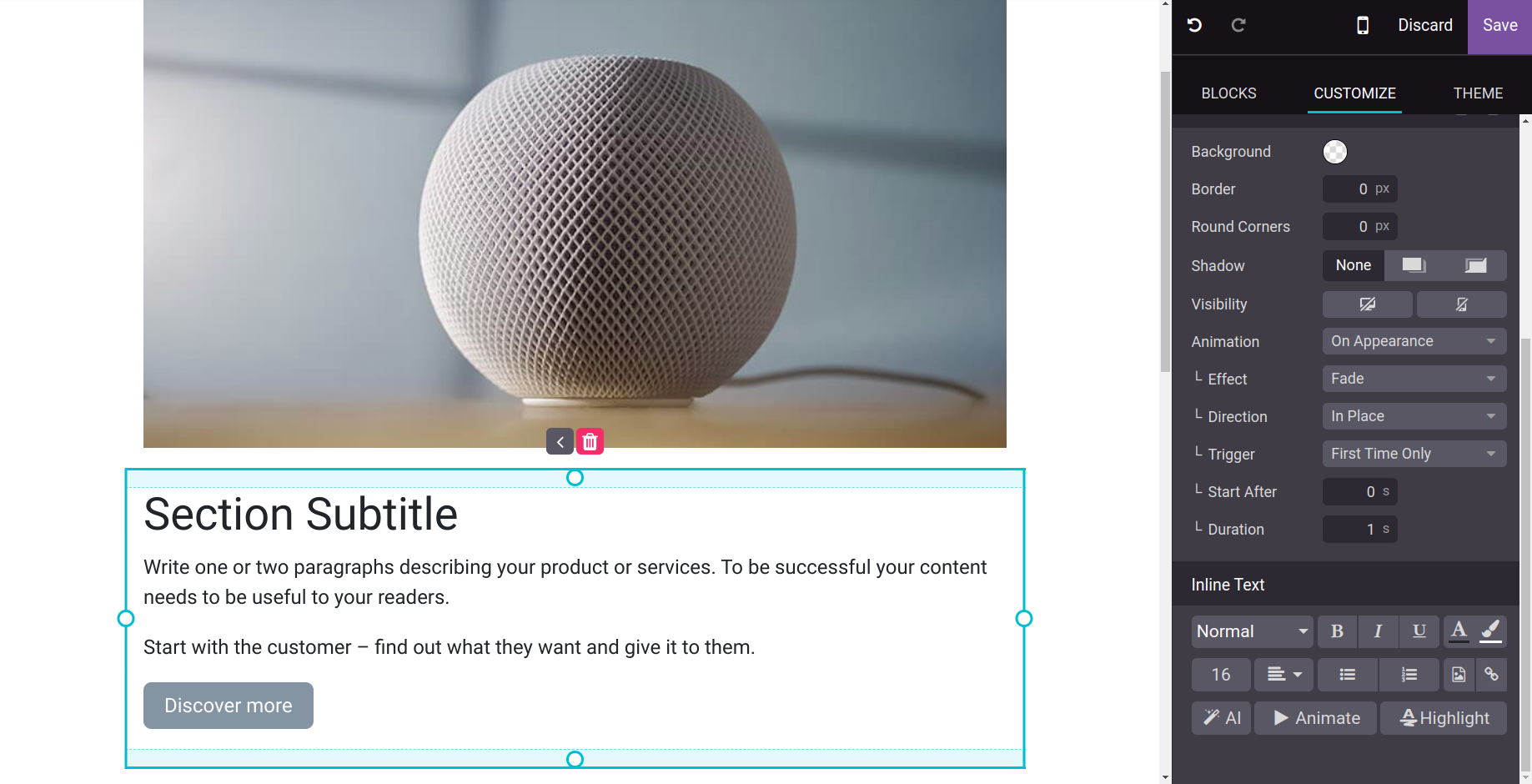 Дараа нь, текстийн чиглэл болон эдгээр өөрчлөлтийг энэ өөрчлөн тохируулсан элементийг ашиглан Inline Text хайрцагт хийж болно. Та мөн энд текст тодруулагч ашиглаж болно.