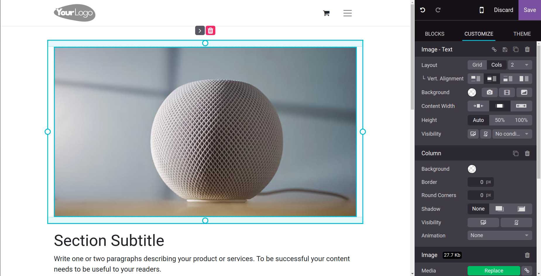 Хэрэглэгч зургийн байршлыг "Зохион байгуулалт" сонголтыг ашиглан өөрчилж болно. Босоо байрлал, дэвсгэр, контентын өргөн, өндөр, харагдах байдал зэргийг тохирох сонголтоор хялбархан өөрчилж болно. Дараа нь хэрэглэгч дараагийн хэсэгт дэвсгэр өнгийг өөрчилж болно. Дараа нь хүрээ, бөөрөнхий булан, харагдах байдал, сүүдэр, текст болон зургийн хөдөлгөөнт дүрс нэмэх сонголтууд байна.