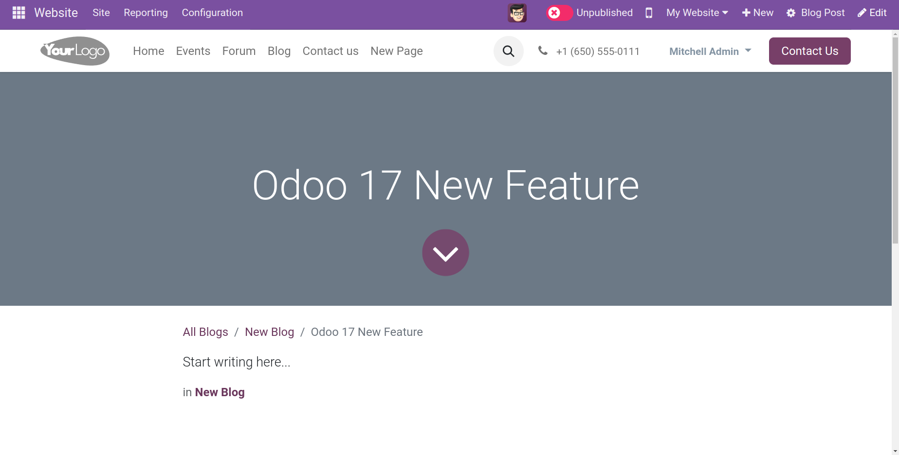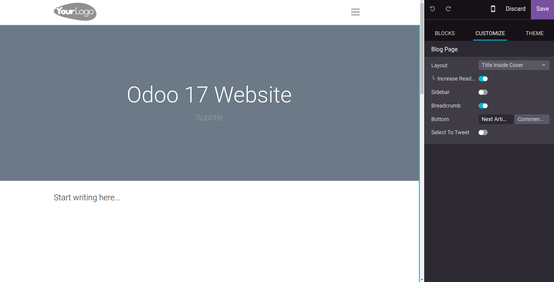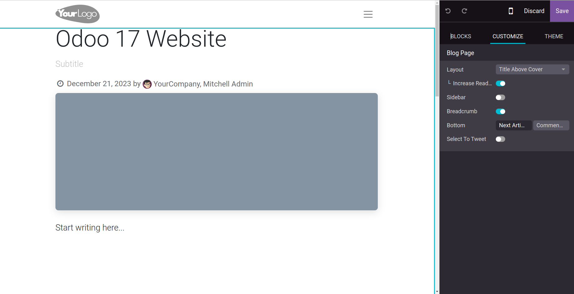 Odoo 17 функцын тусламжтайгаар хэрэглэгчид блог нийтлэлүүд болон тэдгээрийн агуулгыг хувийн болгож болно. Жишээлбэл, тэд Layout-г Хавтасны дотор талын гарчиг болон Хавтасны дээгүүрх гарчиг болгон тохируулж болно. Хавтасны дээгүүрх гарчиг: Эндээс харахад блогын гарчиг хавтасны дээгүүр харагдана.