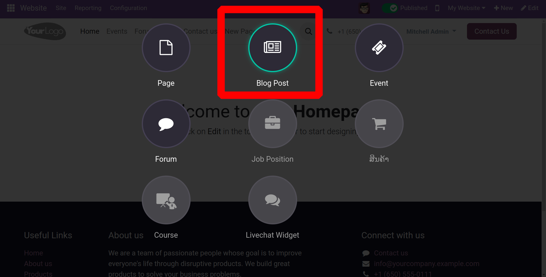 Өмнө нь хийсэн блогоо сонгосноор бидэнд блогт шаардлагатай контент нэмэх боломж гарч ирнэ. Үүнээс гадна, доор үзүүлсэн шиг хэрэглэгч блок нэмэх, сэдвийг өөрчлөх, хуудас болон контентыг цаашид өөрчлөх боломжтой.