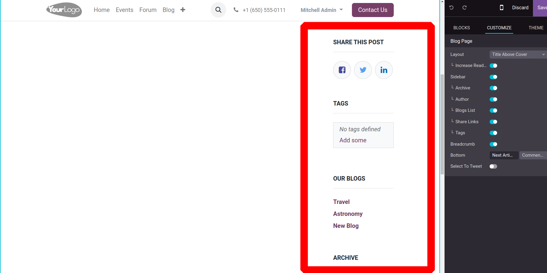 Түүнчлэн, хэрэглэгч дээр дурдсанчлан нийтлэл хуваалцах боломж, нийтлэлд ашигласан шошго гэх мэт блогын хажуу талд нэмэлт мэдээлэл нэмдэг SideBar-г идэвхжүүлэхийг сонгож болно. Хэрэглэгч мөн уншигдахуйц талбарыг нэмэгдүүлэх боломжтой бөгөөд энэ нь блогын агуулгыг сайжруулж, хэрэглэгчдэд илүү харагдахуйц болгодог.