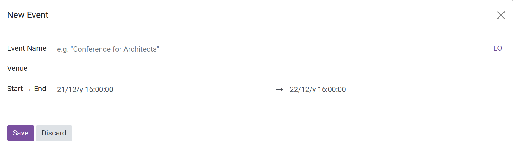 "Шинэ" товчлуур нь хэрэглэгчдэд ар талаас нь шинэ арга хэмжээ үүсгэх боломжийг олгодог. Товчлуурыг дарахад доор үзүүлсэн шиг арга хэмжээний эхлэх болон дуусах огноо, газар, нэрийг харуулсан цонх гарч ирнэ.