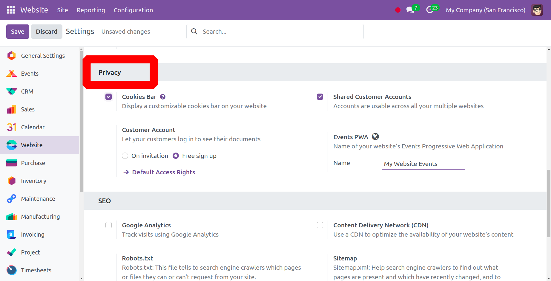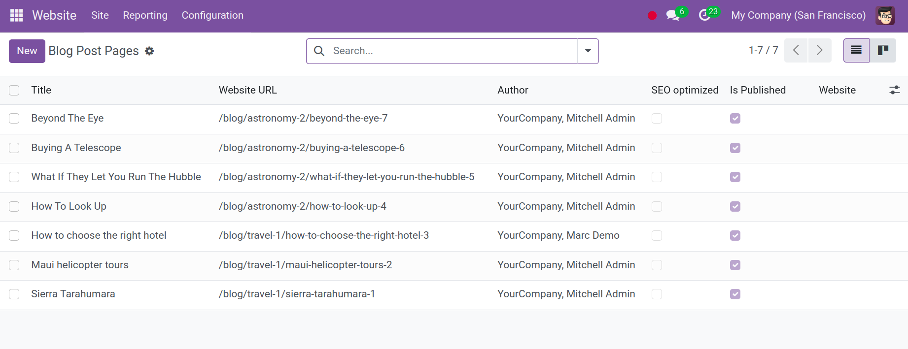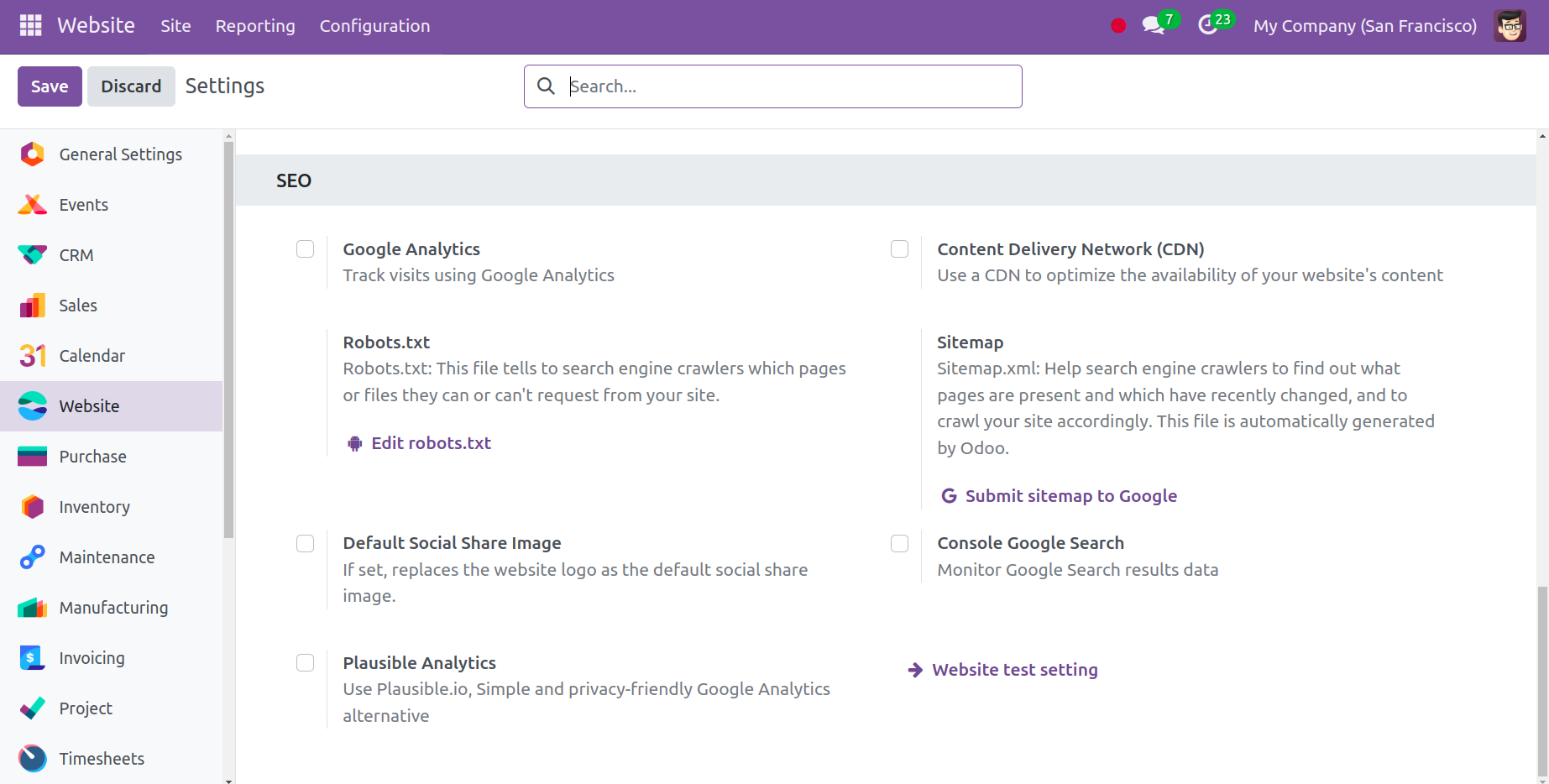 Odoo Вэбсайт модуль нь таны вэбсайтыг бэхжүүлэх, сайжруулахын тулд дээд зэрэглэлийн SEO оновчлолын сонголтуудыг санал болгодог. Модулийн вэб хуудсуудын SEO талыг зохицуулах тусгай цэс харагдаж байна. Доор үзүүлсэнчлэн, вэбсайт модулийн Сайтын цэс нь та SEO-г оновчтой болгох сонголтыг олох болно.