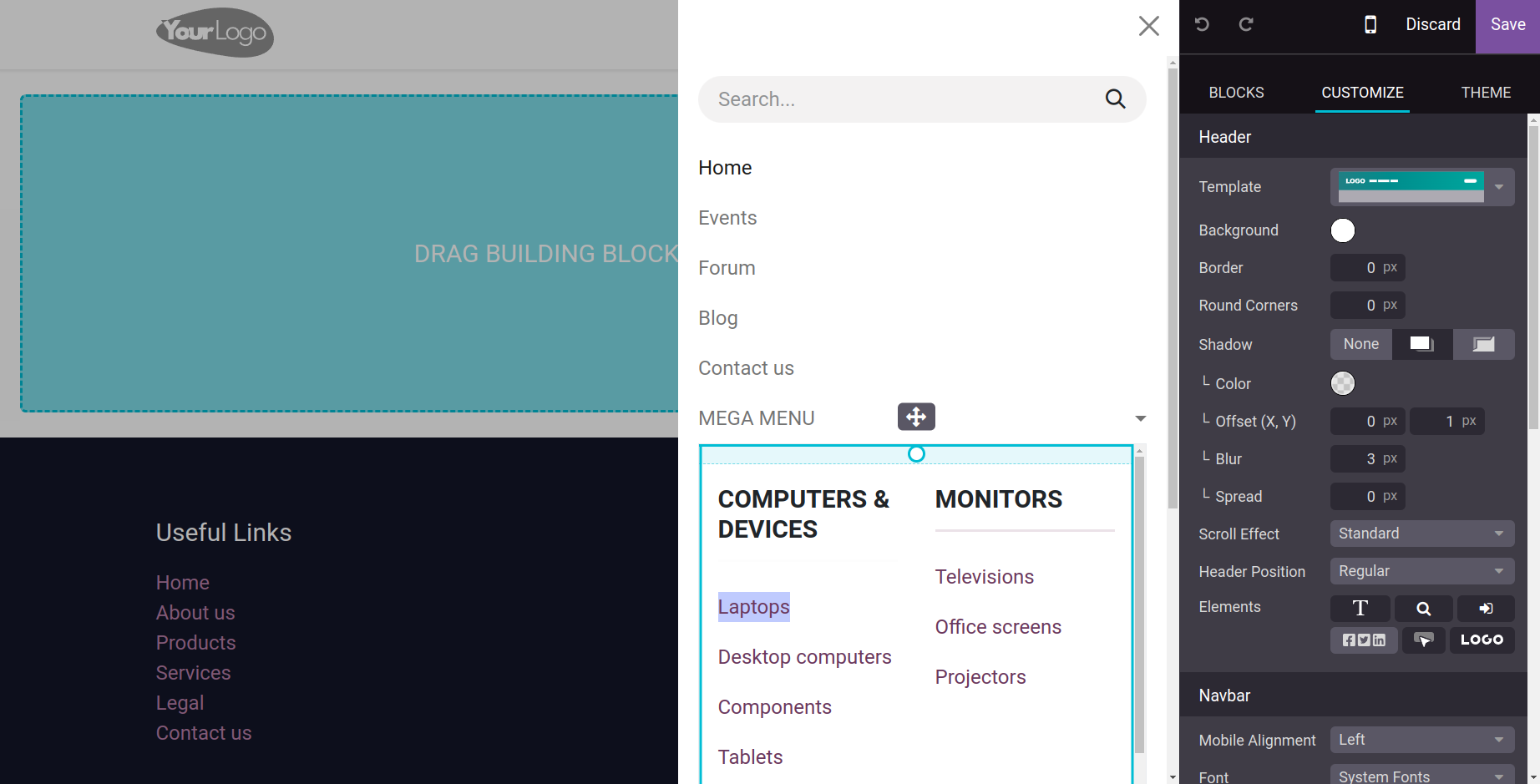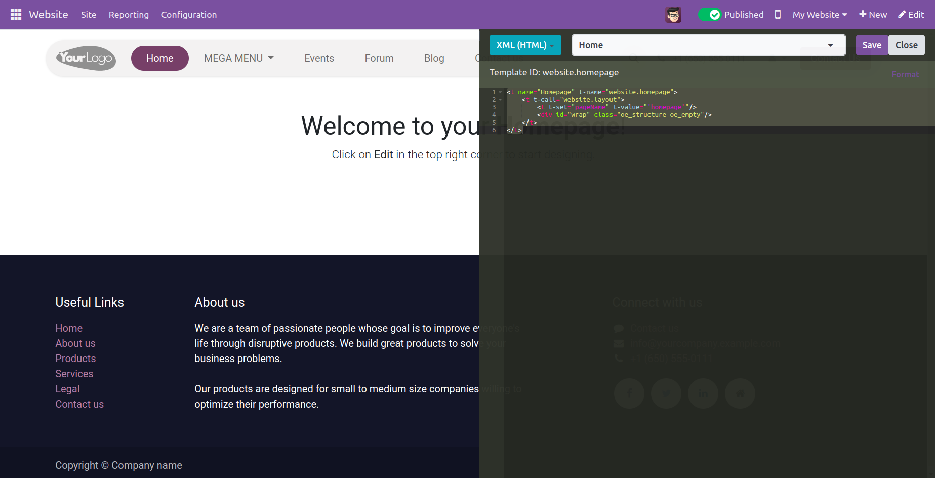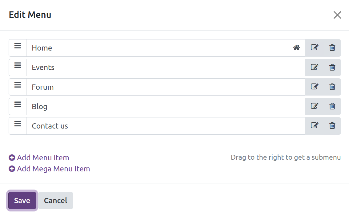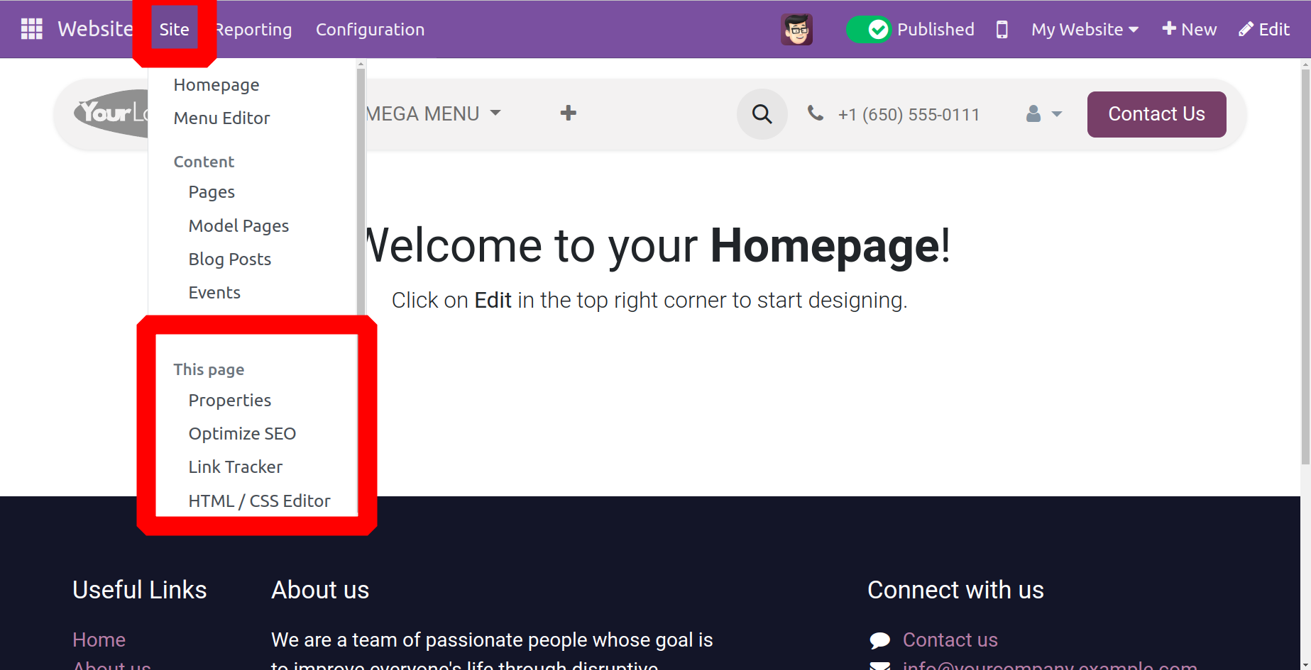 Ийм байдлаар Odoo дээр цэс болон мега цэс үүсгэж болно. Үүсгэсний дараа хадгалж, доор үзүүлсэн шиг Засах сонголтыг ашиглан Мега цэсийг өөрчилье.