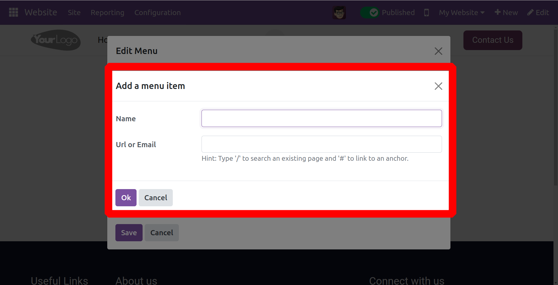 Энэ попап цонх нь танд имэйл хаяг эсвэл URL хаягийг шинэ цэсний шошгын нэрийн хамт оруулах боломжийг олгоно. Шаардлагатай бүх өгөгдлийг оруулсны дараа OK товчийг дарах эсвэл илгээсэн зүйлээ буцаах шаардлагатай бол Цуцлах гэснийг сонгоно уу.