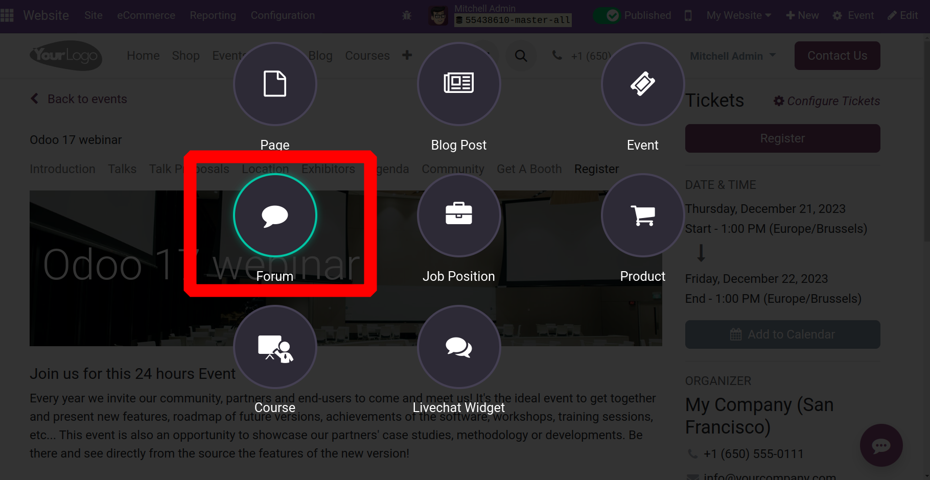 Та Odoo 17 Вэбсайт модуль дээр форумын бичлэгүүдийг хялбархан үүсгэж болно. Үүнийг хийхийн тулд +Шинэ цэс рүү очоод доор үзүүлсэн шиг Форумыг сонгоно уу .