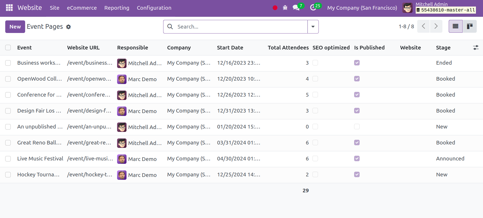 Доорх нь Үйл явдлын Хуудасны жагсаалтын харагдацын дүрслэл юм. Энд та бүх анхдагч үйл явдлын хуудсууд болон тэдгээрийн мэдээллийг олох болно: Үйл явдал, Вэбсайтын URL, Хүлээгдэж буй оролцогчид, Эхлэх огноо, Компани, SEO оновчлогдсон, Нийтлэгдсэн, Вэбсайт болон Үе шатууд. Канбан харах цэсний дүрсийг сонгосноор та жагсаалтын харагдацаас Канбан харагдац руу шилжиж болно.