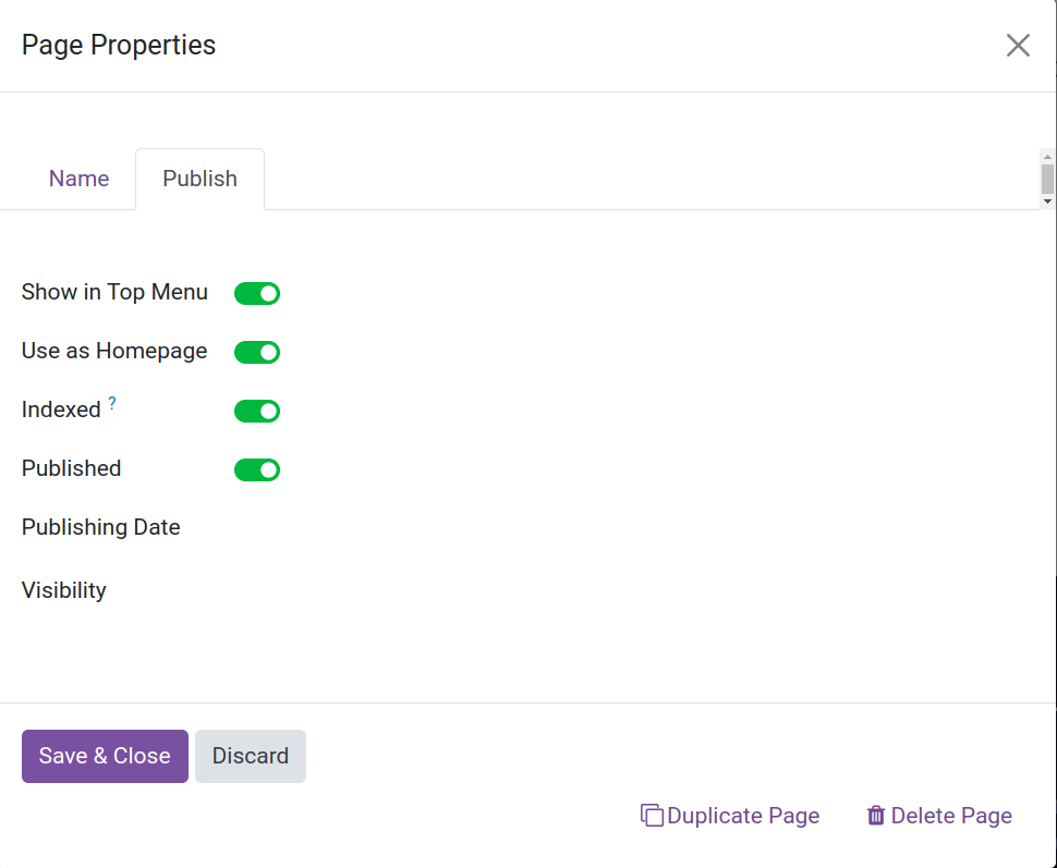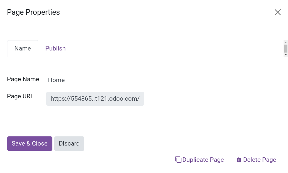 Вэбсайтын хуудсуудыг хэрхэн тохируулахыг урьдчилан харахын тулд Хуудасны шинж чанаруудын цонхонд Хуудасны гарчиг, Хуудасны URL, "Индексжүүлсэн, Дээд цэсэнд харуулах, Нүүр хуудас болгон ашиглах, Индексжүүлсэн, Нийтлэгдсэн, Нийтлэгдсэн огноо, Харагдац" зэрэг сонголтуудыг идэвхжүүлэх зэрэг холбогдох мэдээллийг харуулна. Мөн цонхонд ижил мэдээллийг устгах болон хуулбарлах хувилбаруудыг харуулна.