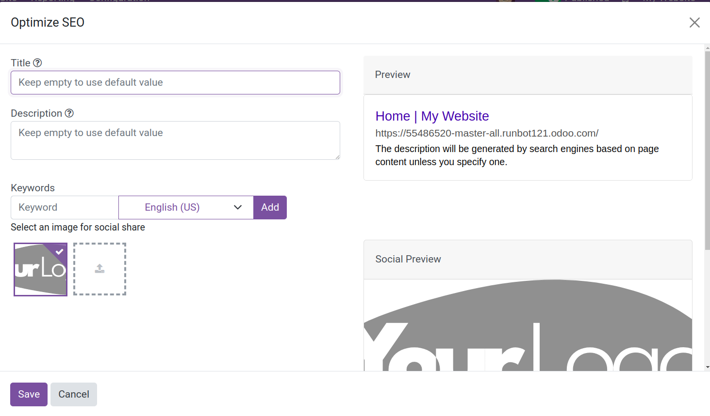 Хэрэв "Анхдагч Нийгмийн сүлжээнд хуваалцах зураг" сонголт идэвхжсэн бол та вэбсайтын логог анхдагч нийгмийн сүлжээнд хуваалцах зураг болгон орлуулах зураг байршуулж болно .