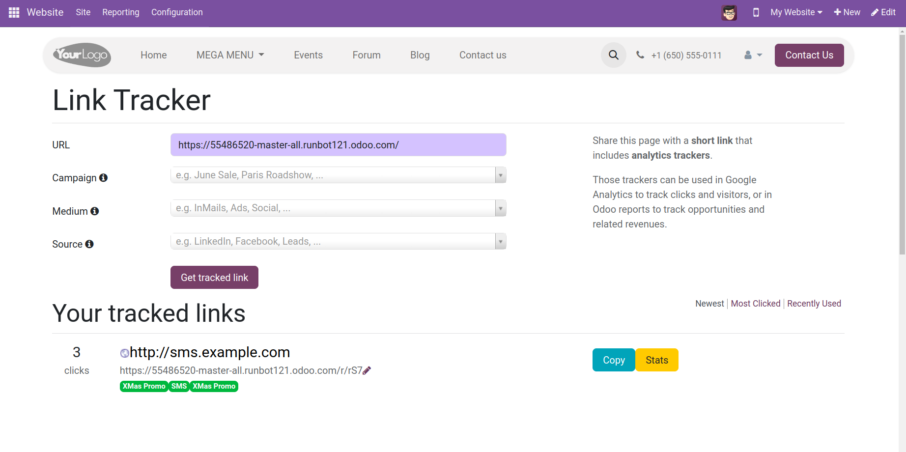 Odoo 17 Вэбсайт модулийн Холбоос Хянагч цэс нь таны вэбсайт дээрх холбоосуудын ажиллагааг хянах, сайжруулахад хэрэгтэй хэрэгсэл юм. Энэ нь танд вэбсайтынхаа холбоосын бүтцийг хянах, холбоосын үзэлт болон товшилтыг хянах, холбоосын гүйцэтгэлийг үнэлэх боломжийг олгодог. Мөн холбоосын гүйцэтгэлийн талаарх цогц аналитик болон өгөгдлийг өгдөг. Холбоос хянагчийн тусламжтайгаар та хурдан дахин чиглүүлэх, зорилтот холбоос болон эх сурвалжуудыг холбох боломжтой. Үүнээс гадна, та хэд хэдэн төхөөрөмж болон эх сурвалжаас шууд арга хэмжээ авах, холбоосын товшилтыг хянах, шинжлэх зорилгоор зорилтот дахин чиглүүлэлтүүдийг тохируулж болно.