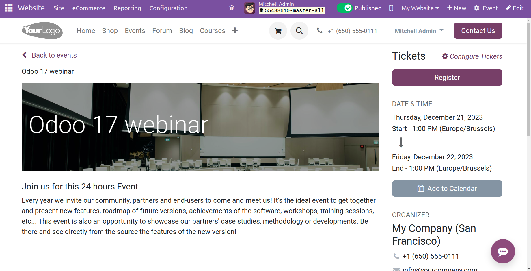 Ямар ч хэмжээ, цар хүрээтэй арга хэмжээг удирдахад зориулсан нэгдсэн, бүгдийг нэг дор багтаасан платформ. Арга хэмжээ зохион байгуулагчийн ажлын бүх талыг, түүний дотор харагдах байдал, сурталчилгаа, тасалбарын борлуулалт, арга хэмжээний төлөвлөлтийг Odoo 17 Events удирддаг.