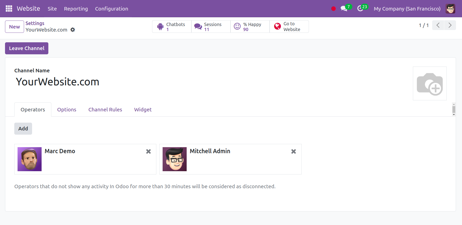 Операторууд: Чат хүссэн мессежүүдэд хариу өгөх агентуудыг оруулна уу. Та хүссэн хэмжээгээрээ нэмж болно, гэхдээ хэрэв оператор Odoo дээр гучин минутаас илүү хугацаанд юу ч хийхгүй бол түүнийг холболт тасарсан гэж үзнэ гэдгийг санаарай.