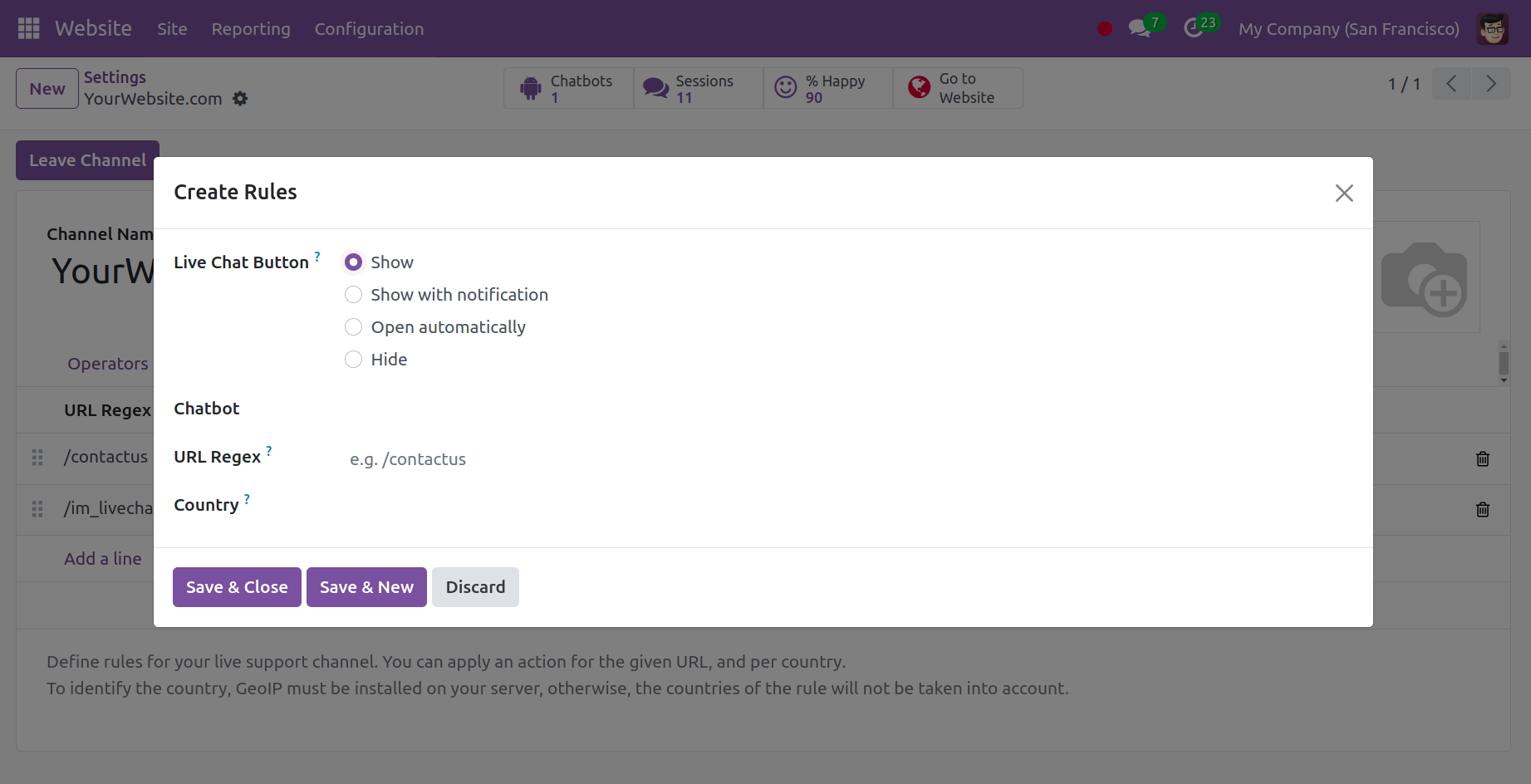 Сувгийн дүрэм: Тодорхой URL болон/эсвэл улсын хариултыг сонгоно уу. Доорх жишээнд хэрэглэгчид (аль ч улсаас) бидэнтэй холбоо барих хуудсанд ирэхэд тодорхой хугацааны дараа чатын цонх автоматаар нээгдэнэ.