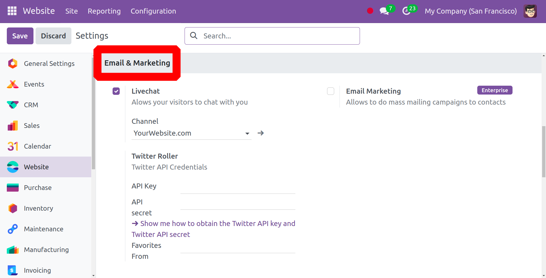 Шууд чат байршуулсны дараа, хэрэв та вэбсайтаа Odoo 17 ашиглан бүтээвэл энэ нь таны мэдээллийн санд нэмэгдэх болно. Процедурыг дуусгахын тулд Вэбсайт > Тохиргоо > Тохиргоо > Шууд чат руу очно уу . Дараа нь вэбсайт руугаа холбохын тулд аль сувгийг ашиглахаа шийдэх эсвэл шууд нэгийг нь үүсгэнэ үү.