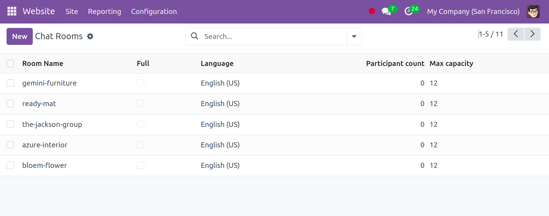 Ар талаас хэрэглэгчид вэбсайт дээр үүсгэсэн чатын өрөөнүүдийнхөө бүх дэлгэрэнгүй мэдээлэлд хандах боломжтой. Тохиргоо табыг сонгоод Чат ​​Өрөөний сонголтыг сонгоно уу . Та өрөөний нэр, бүтэн хүн, хэл, оролцогчдын тоо, хамгийн их багтаамжийг шалгаж болно. Шинэ чатын өрөө нэмэхийн тулд Шинэ товчийг дарна уу.