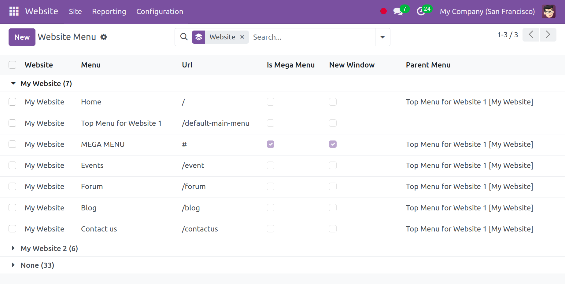Та энэ жагсаалтад олон вэбсайтын бүх цэсийг нэг дор үзэх боломжтой. Вэбсайтын нэр, URL хаяг, мега цэстэй эсэх. Жагсаалтад гарч буй дэлгэрэнгүй мэдээлэл нь эцэг цэс болон шинэ цонх юм. Шинэ контент нэмэхийн тулд Шинэ товчийг дарна уу.