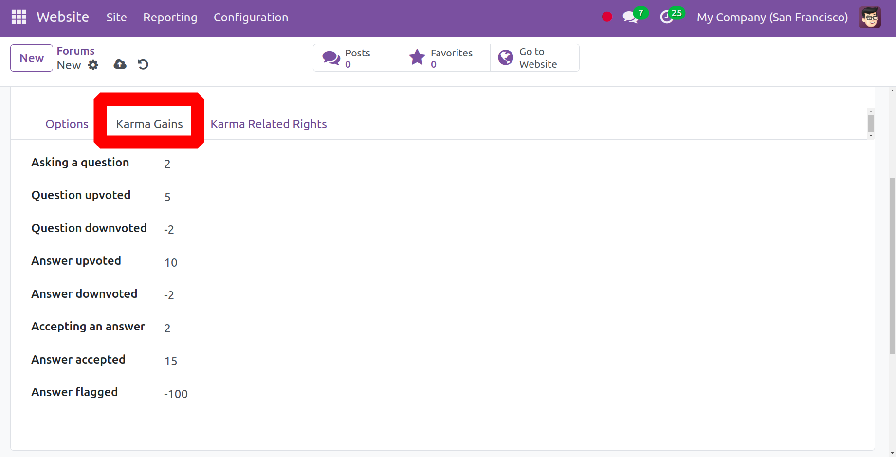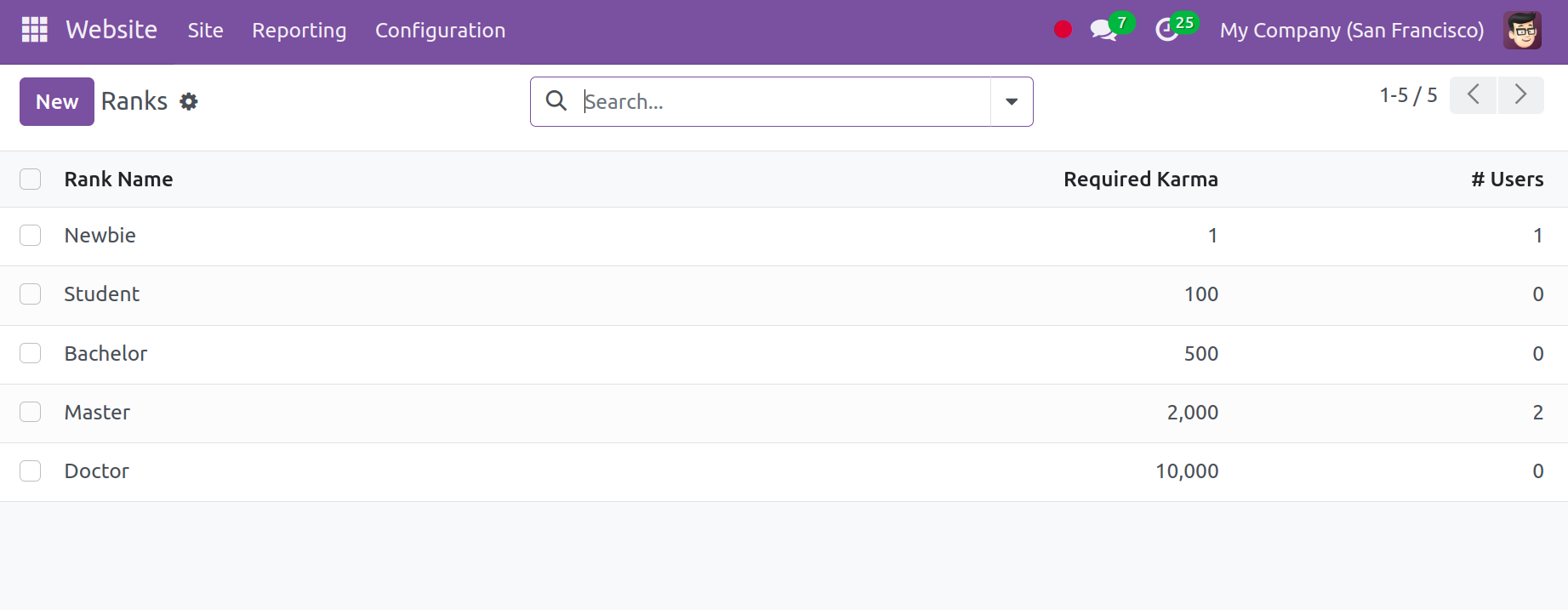 Форумын оролцогчдын өөр өөр зэрэглэлийг Odoo 17 Вэбсайт модулийн Тохиргооны цэсийг ашиглан тодорхойлж болох бөгөөд хэрэглэгч форум дотроос хандах боломжтой. Та доор үзүүлсэнчлэн энэ платформ дээрх тохируулсан зэрэглэл бүрийн дэлгэрэнгүй мэдээллийг харж болно. Таны карма оноо нь зэрэглэлд хэр хол явахыг тодорхойлно.