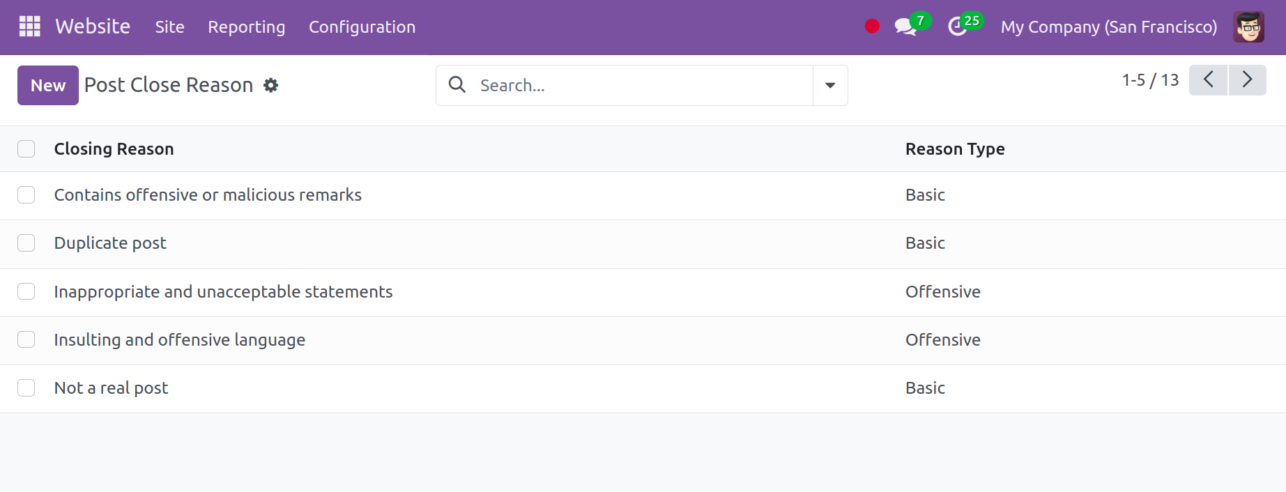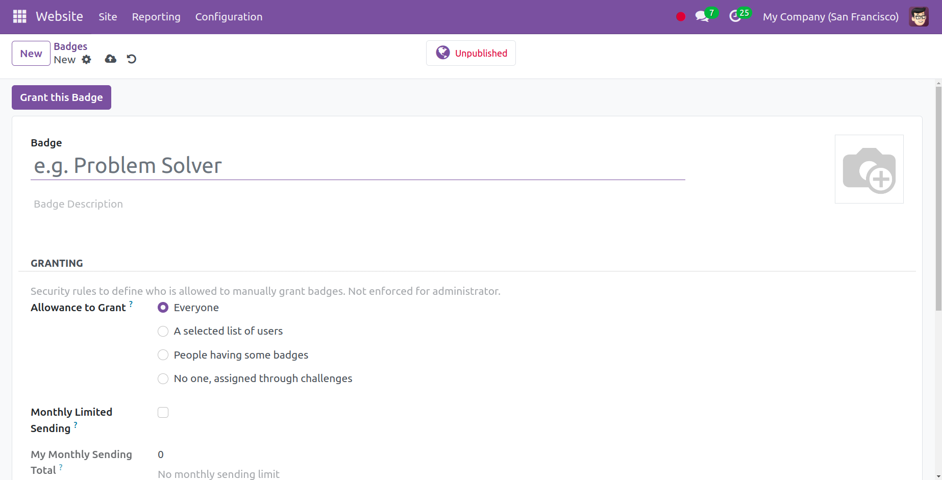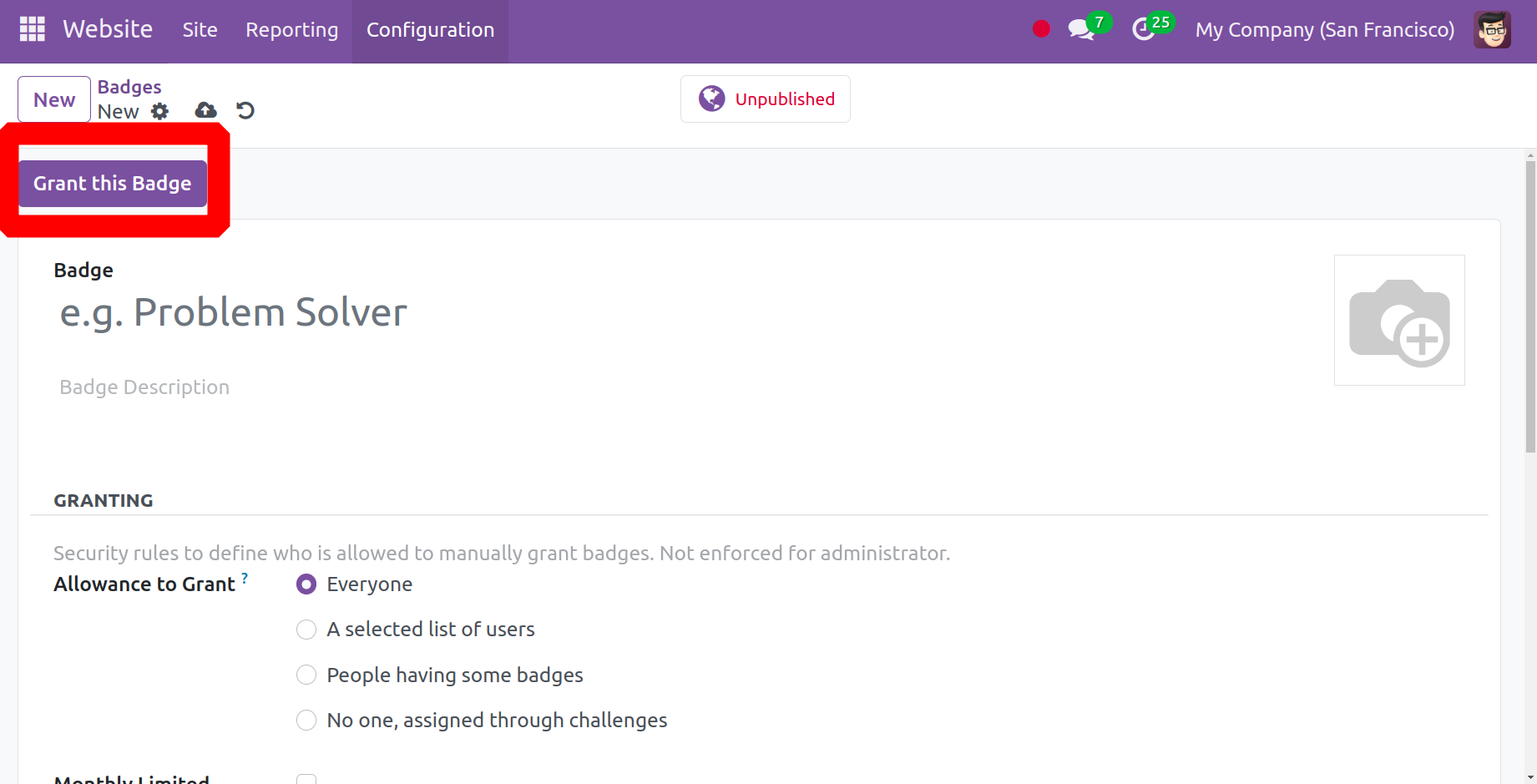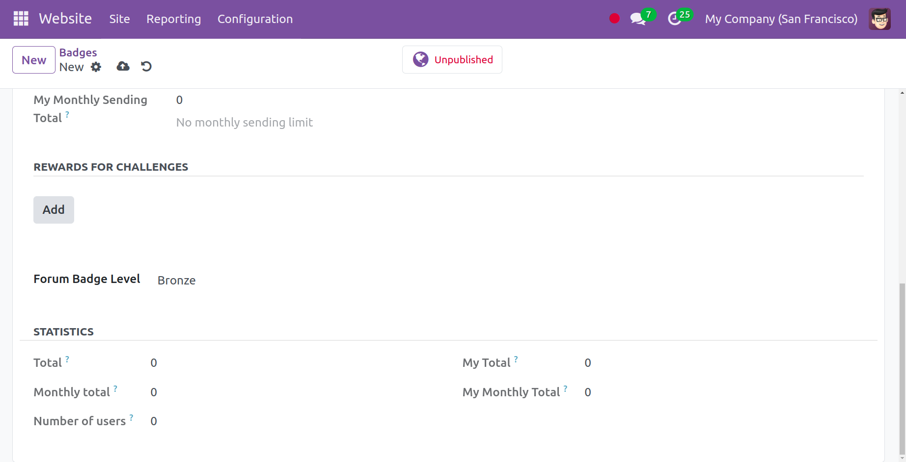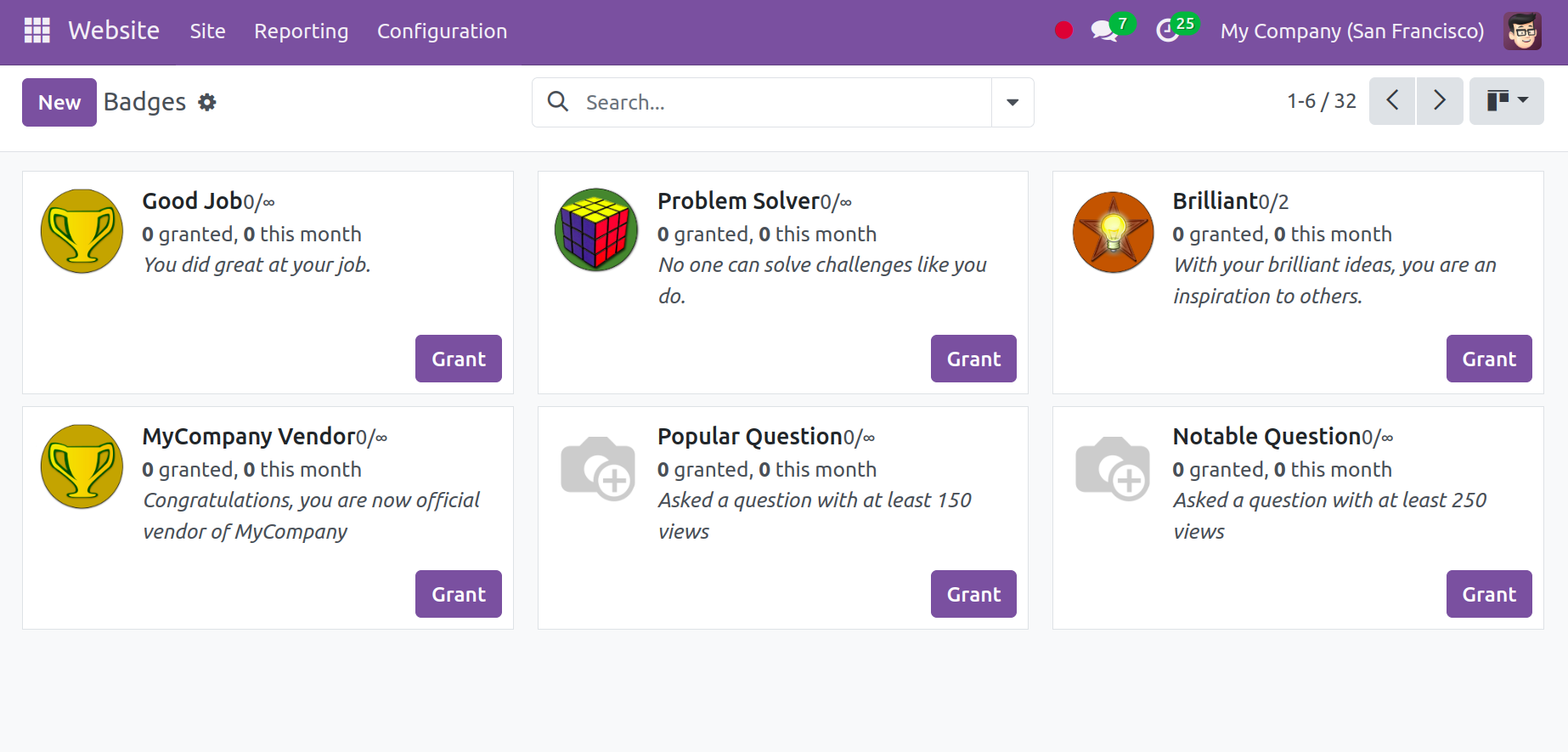Таны вэбсайт дээрх форумын бичлэгүүдийг үздэг хэрэглэгчдэд зориулсан тэмдэг хийх, хадгалах зориулалттай платформ нь Odoo 17-д багтсан болно. Та форум дээрээ танилцуулсан янз бүрийн үйл ажиллагаанд оролцож, хэрэглэгчид тэмдэг авах боломжийг олгох тодорхой тохиргоог тохируулж болно. Эдгээр тэмдгийг вэбсайт дээрх ажлуудыг гүйцэтгэсний шагнал болгон өгдөг.