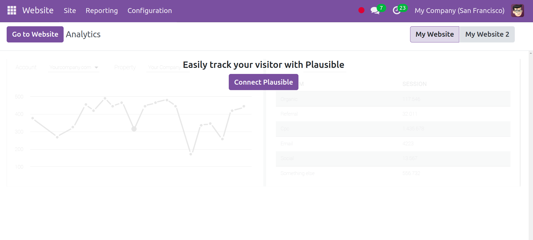 Дараагийн алхамд манай Google Analytics сайтын мөрдөх ID шаардлагатай. Үүний тулд бид Google Analytics дээр бүртгэл үүсгэх шаардлагатай. Амжилттай нэвтэрсний дараа бид бүртгэлийн нэр, бүртгэлийн дугаар, вэбсайтын нэр, URL хаягийг оруулснаар Google Analytics өмчийг үүсгэдэг. Хяналтын ID-г авсны дараа бид Google Analytics API-д зориулсан үйлчлүүлэгчийн ID-г үүсгэх ёстой. Бид амжилттай нэвтэрсний дараа эхлээд Analytics API-г сонгосноор Analytics API-ийн итгэмжлэлүүдийг үүсгэдэг. Бид шинэ төсөл үүсгэж, Analytics API-г идэвхжүүлж, Analytics API-г сонгосны дараа API итгэмжлэлүүдийг тохируулдаг. Дараа нь үйлчлүүлэгчийн ID-г үүсгэж болох бөгөөд эцэст нь "Google Analytics-д хандах" товчийг сонгосноор бид Odoo-д Google Analytics-д хандах эрхийг олгож болно. Бага зэрэг ачаалсны дараа манай Odoo вэбсайтад зочилсон хүмүүсийн тоог харуулсан график одоо манай хяналтын самбарт гарч ирнэ.