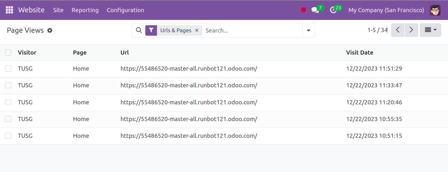Таны вэбсайт дээрх зочдын үйл ажиллагааны нарийвчилсан дүн шинжилгээг Odoo 16 Вэбсайт модулийн Тайлангийн хуудаснаас Хуудас харах цэсээр дамжуулан олж болно. Энэ нь нийт зочдын тоо, хуудас тус бүрийн зочдын тоо, хуудас бүрийн үзсэн тоо, зочны нэр, хуудасны нэр, URL, бүтээгдэхүүн, зочилсон огноо, зочилсон дундаж хугацааг өгдөг. Нэмж дурдахад та энэ цонхоор зочлох замаар хамгийн алдартай хуудсууд, мөн хамгийн алдартай орох болон гарах хуудсуудыг олж мэдэх боломжтой. Та эдгээр сонголтуудаас гадна хуудас харах цэснээс урьдчилан тохируулсан болон өөрчлөн тохируулсан шүүлтүүрийн параметрүүдийг ашиглан үр дүнг улам боловсронгуй болгож болно. Цонхны анхдагч шүүлтүүрүүд нь Хуудас, URL ба Хуудас, Бүтээгдэхүүн юм. Өөрчлөн шүүлтүүр нэмэх нь танд боломжтой өөр нэг сонголт юм.